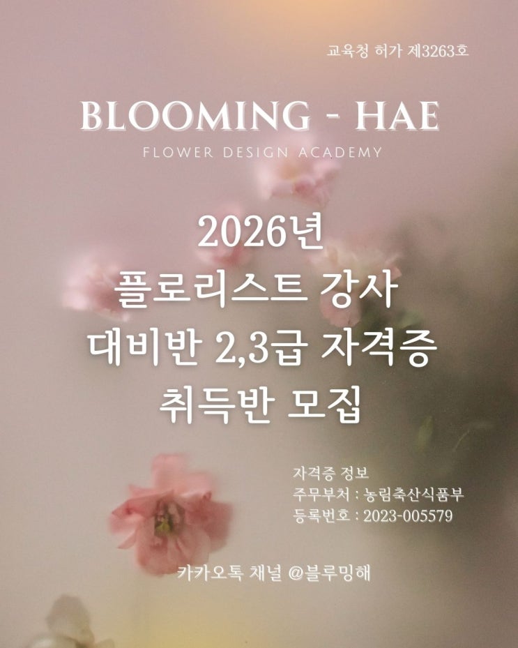 안녕하세요 23년이상 경력의 플로리스트가 운영하는 블루밍해 & 블루밍해 플라워디자인학원입니다. BLOOMING-HAE 블루밍해 브랜드 소개 : 네이버 블로그 2026년 블루밍해 & 블루밍해 플라워디자인학원에서는 학교, 기관, 기업 출강을 메인으로 진행하면서 플로리스트 강사로 활동할 수 있는 플로리스트 강사를 양성하고자 플로리스트 강사 2급, 3급 민간 자격증 취득반을 개강할려고 합니다. 저희 블루밍해에서는 많은 플로리스트 강사님을 양성하는 것이 목표가 아닌 함께 성장할 수 있는 플로리스트 강사님을 양성하여 서로 협력하는 관계로 활동 하실 수 있게 도와드립니다. 단순히 과정을 이수하고 각자생존해야하는 상황이 아닌 성....... <img src="https://blogthumb.pstatic.net/MjAyNjAxMTVfNTgg/MDAxNzY4NDYzMzc4NDA0.O6HmTKAxHOhnjIbte8OH6yVtNDN2rId0FcAb6qgxKAAg.xLKLtfcF0gdqNkZQ4NXDYJ4hIO3uZDkES8avTPBMX6Mg.JPEG/Pink_Aesthetic_Feminine_Inspirational_Motivational_Quote_Instagram_Post_%282%29.jpg?type=s3" />