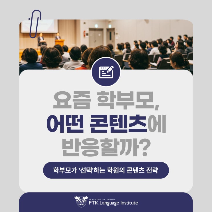 안녕하세요, FTK English입니다. 학부모의 소비 트렌드는 빠르게 변화하고 있습니다. 단순히 “좋다, 효과 있다”는 말만으로는 학부모의 선택을 이끌어내기 어려운 시대입니다. 이제는 ‘왜 이 학원이어야 하는지’를 명확하게 설명하고, 실제로 확인 가능한 정보와 콘텐츠로 신뢰를 쌓는 것이 무엇보다 중요합니다. 요즘 학부모가 반응하는 콘텐츠의 방향을 5가지 키워드로 정리해보았습니다. 과장되기만 한 홍보보다는 ‘설명 가능한 정보’를 선호합니다 요즘 학부모들은 감에 의존하지 않습니다. “우리 학원은 잘 가르칩니다”, “성과가 좋습니다”라는 말만으로는 설득되지 않습니다. 학부모가 움직이는 콘텐츠는 다음과 같은 특징을 지....... <img src="https://blogthumb.pstatic.net/MjAyNjAxMTZfMTk1/MDAxNzY4NTIzNzIxNDEy.XygdymyP6G_X6ciBATIwSzNeQGMpNfOsUo4ioOcxX4Yg.0db07lI1MvtEM53Ad6sPvQ5j8NgXjcVydrURJ8Qq0EYg.JPEG/001.jpg?type=s3" />