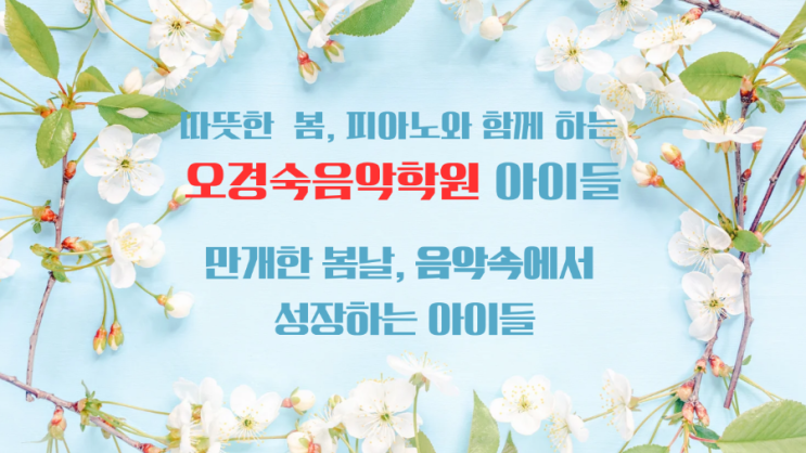 안녕하세요. 전농동 오경숙음악학원입니다. :) 따뜻한 햇살과 살랑이는 바람, 그리고 거리마다 아름답게 피어난 꽃들 덕분에 봄이 한층 더 가깝게 느껴지는 요즘입니다. 이렇게 화사한 계절 속에서 오경숙음악학원에도 봄처럼 밝고 사랑스러운 풍경이 매일 이어지고 있습니다. 바로 피아노 앞에 앉아 한 음 한 음 정성껏 연주하며 열심히 수업을 받고 있는 우리 아이들의 모습입니다. 아이들의 진지한 눈빛 속에 담긴 노력과 집중 작은 손끝으로 만들어가는 소중한 성장의 시간 요즘 아이들의 수업 모습을 보고 있으면 꽃이 피어나듯 실력도 조금씩, 그러나 분명하게 자라고 있다는 것이 느껴집니다. 처음에는 건반을 누르는 것....... <img src="https://blogthumb.pstatic.net/MjAyNjAzMjhfMTY1/MDAxNzc0Njg3Mzg0NzUw.iWR4_Cenu6SgFrBvmxb6yeIzLqXiO8ofyQOSQV2O-eQg.lO18VFIIjRCE-xz5iAQXy-UDgLvqY5dQ2Sh_DzV5oMwg.PNG/900%A3%DF1774661443758.png?type=s3" />