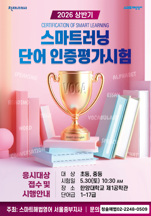 드디어 서울 중부지사 주최로 동대문구 성동구, 광진구, 마포구, 용산구, 은평구 등의 많은 서울지역의 스마트 해법영어 학생들이 참가하는 제3회 스마트러닝 단어 인증평가시험이 다가 옵니다. 2025년 한양대에서 열렸던 작년 인증대회가 생각나네요. ^^ 이번 해에는 중부지사의 성장으로 작년보다 출전 교실들이 많이 늘어날 예정입니다. 매일 매일 자신과 싸우며, 선생님과 밀땅하며 열심히 단어를 외웠던 또 지금도 외우고 있는 우리 친구들 실력을 맘껏 뽐낼수 있겠네요 ^^ 벌써부터 600 words로 첫 출전하는 전농초 3학년 친구는 집에서 단어 1000번쓰다가 팔 빠질뻔 했다고 하고요. ㅎㅎㅎ 작년 5학년때 최우수상 받은 전동초 6학년 친구....... <img src="https://blogthumb.pstatic.net/MjAyNjAzMzFfMTM4/MDAxNzc0OTQwNDYyOTA0.IHIz9M1Sc6F2jJT935hcaIeLj2hbmb73nRuk6-VZGnkg.rErpbv_EN8NmD2jplIl_sHAhUhkgguQQ0WgVXyc_U1Ag.PNG/1773361992940.png?type=s3" />