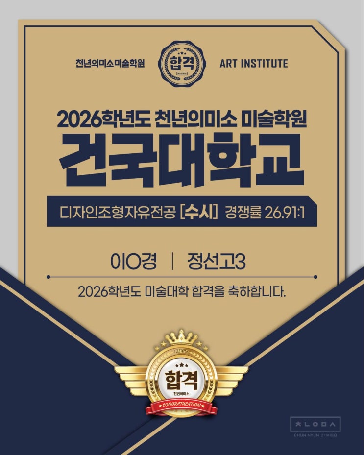 2026학년도 수시 실기100% 전형 ~ 건국대 글로컬 디자인조형자유전공학부 3명 합격!!! 2026학년도 건국대 글로컬 수시합격을 축하합니다~^^ 아슬아슬~~ 미대에 대한 바른 고민 강릉 천년의 미소 미술학원 <img src="https://blogthumb.pstatic.net/MjAyNTEyMjRfMjY1/MDAxNzY2NTU2OTk0NTAw.R0xwJgm9Fwz_XdgIJL6JHFGLzm7cpmYr6vb7CHDVgqgg.4tkZr4d-yh4gFLbWkb_jNrXuX4Gu2NH-MbDLW1_cUSgg.JPEG/%B0%C7%B1%B9%B4%EB-%C0%CC%BC%BA%B0%E6_%C0%DA%C0%AF%C0%FC%B0%F8-%BF%B5%BB%F3%BF%EB-01.jpg?type=s3" />