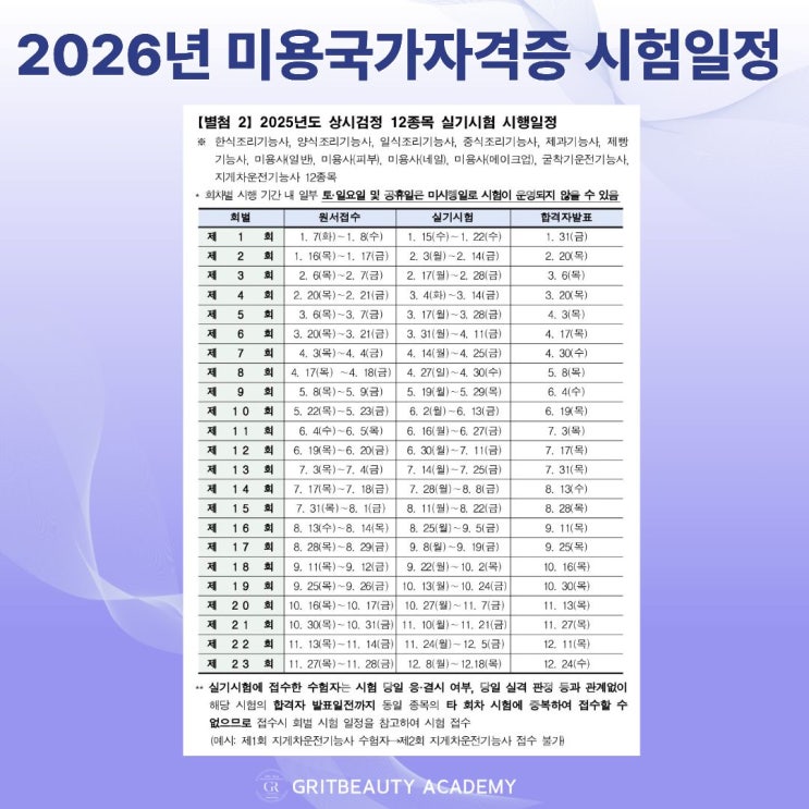 안녕하세요 그릿뷰티아카데미입니다. 어느덧 2025년이 마무리되고, 2026년의 시험일정이 공개되었는데요. 2026년 미용국가자격증 필기시험, 실기시험 일정 공개하겠습니다. 1. 2026년 필기시험 시험일정 2. 2026년 실기시험 시험일정 위 자료는 큐넷에서도 확인하실 수 있습니다. 2026년도 열심히 도전하는 해가 되길 바랍니다:) 학원을 선택하기 전, “나에게 맞는 수업인지”를 확인하는 건 매우 중요합니다. 상담을 통해 "개인현재 상황, 시험 일정, 합격까지의 커리큘럼" 을 솔직하게 안내해드립니다. 고민만 하다 도전 시기를 놓치지 않도록, 방향을 잡는 상담부터 받아보셔도 괜찮습니다. 혹시라도 이 글을 보셨다면, 그게 기회....... <img src="https://blogthumb.pstatic.net/MjAyNTEyMjJfMjc4/MDAxNzY2MzgzMjIyNDk0.OUkPKfON_Ntb_x4dPfXRshlUIPktIDEQVnVRbpw1kXUg.G3zkrUyEY3exOsaBzDhpobWgot9msGtSfWVU8v-8fQgg.JPEG/%C1%A6%B8%F1%C0%BB_%C0%D4%B7%C2%C7%D8%C1%D6%BC%BC%BF%E4._%283%29.jpg?type=s3" />