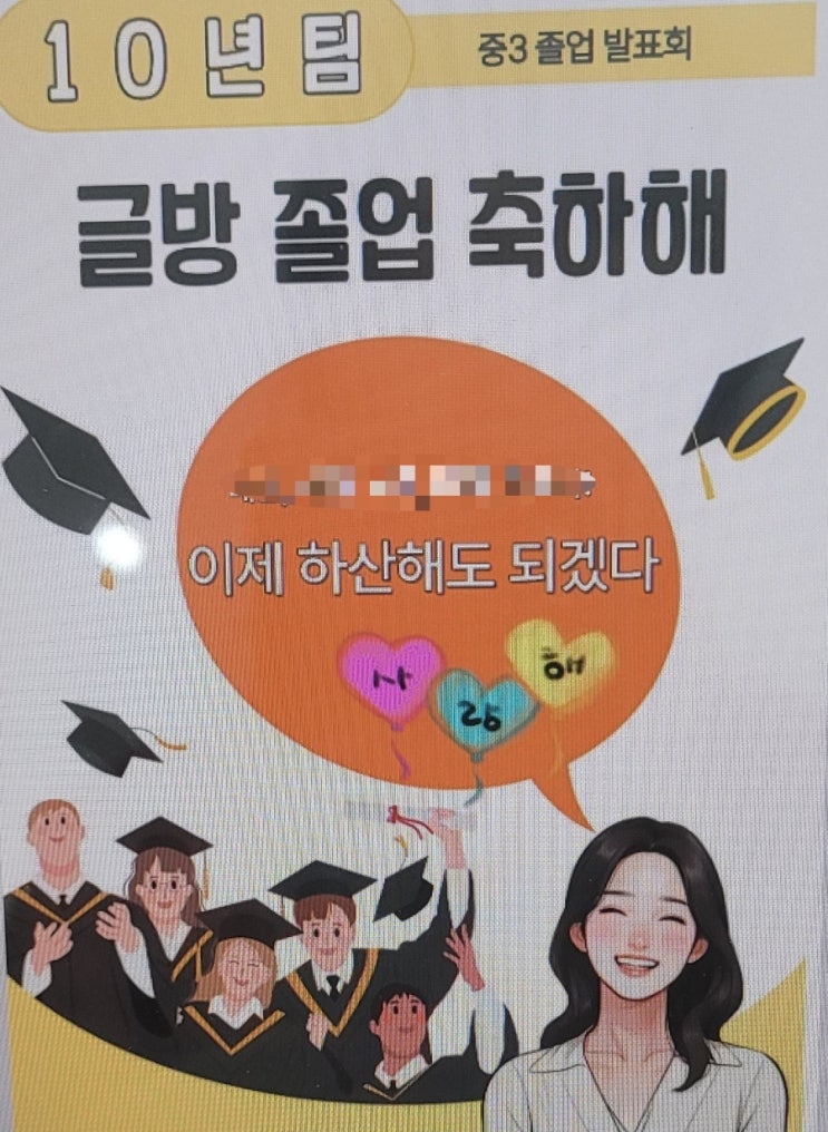 10년팀이란 일곱 살 때 처음 왔던 꼬맹이가 고등학생이 되는 팀이다. 인생의 3분의 2를 글방과 함께 했다니... 모두 잘해왔고 칭찬한다. 더 많은 것을 배우고 익혀 멋지게 더더더 성장해라. 보이지 않아도 뚝딱샘의 응원이 있다는 것을 기억해. 나의 제자로 와주어서 고마웠다. 발표회 날 우리 울컥하지 말자. 끝까지 파이팅! <img src="https://blogthumb.pstatic.net/MjAyNTEyMjRfMTk1/MDAxNzY2NTc5MjIzMTI3.iviDqhg0NreFfr9RrpL8fdWRVbo-r-vP2sCBg6JrWLQg.SL_5zlyHv2lQkq9k7U7KutMk76Q5VivRuTnZ-DHVLxEg.JPEG/900%A3%DF1766579222895.jpg?type=s3" />