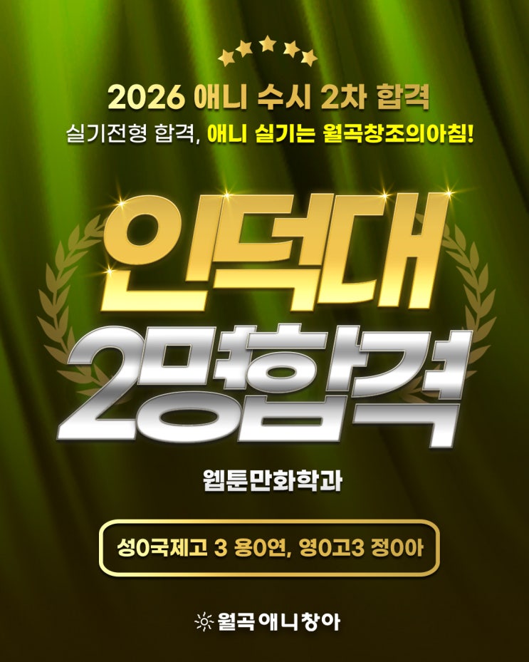 안녕하세요. 월곡창조의아침 미술학원입니다. 이번에 전해드릴 소식은 인덕대학교 수시 2차 합격 소식입니다. 무려 2명의 학생이 웹툰만화학과에 합격한 소식인데요. 먼저 성0국제고3 용0연 학생 축하드립니다 ~~ 항상 열심히 실기를 준비한 학생으로 합격할 줄 알았는데 이렇게 합격하였네요! 다음은 영0고 3 정0아 학생 인덕대 웹툰만화학과 애니입시 수시 합격을 축하드립니다 ~ 애니입시는 역시 월곡창조의아침입니다! 만화 애니 전문 월곡창아는 정직한 과정과 결과를 보장 드립니다. 다음은 영0고 정0아 학생 인덕대 수시 합격을 축하드립니다 ~ 두 학생 모두 인덕대학교 수시 2차 웹툰 만화 학과로 합격하신 것을 합격증과 함께 확인하실....... <img src="https://blogthumb.pstatic.net/MjAyNTEyMjNfMjM3/MDAxNzY2NDg5NTE3Mjk2.5Kb-p1fbHLJmTo73nE6V2qw3wPQMvWCaSjMhcx_-8jgg.V3rdPTb2UFL9u2n4IIEbjSc6SN4I-8KjHdBWrz3GB1Mg.JPEG/SNS-%C0%CE%BD%BA%C5%B8%B1%D7%B7%A5-%BF%EB.jpg?type=s3" />