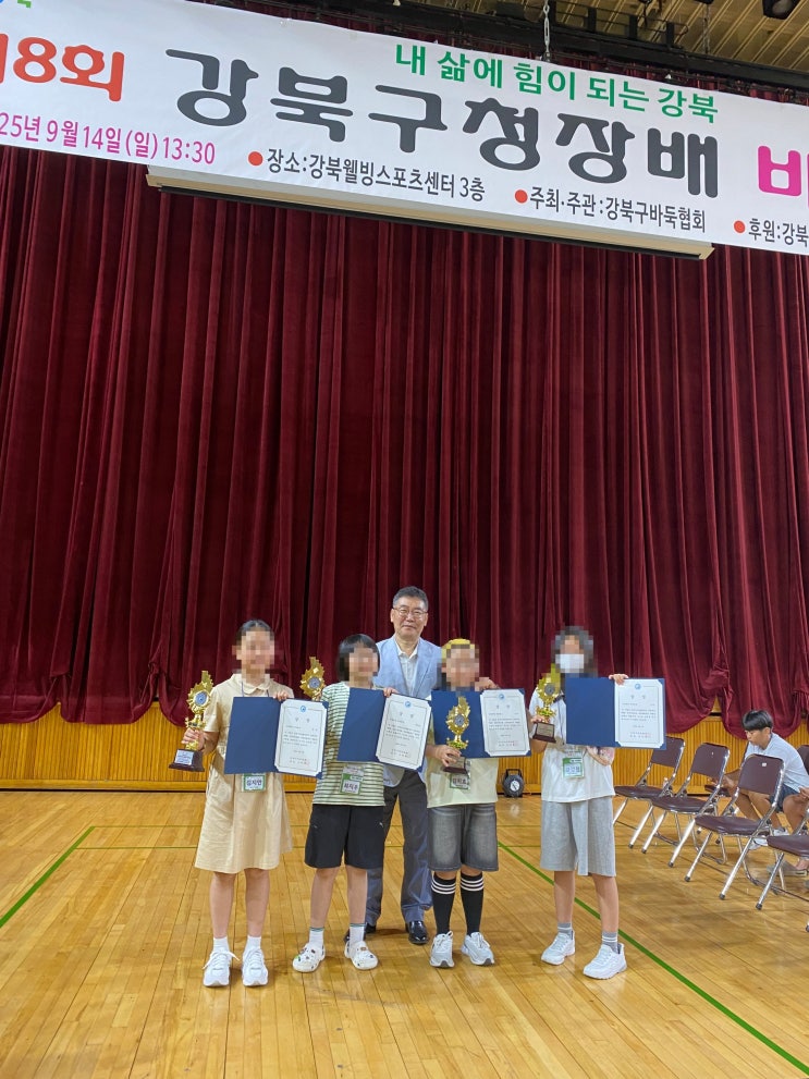 안녕하세요 문원장바둑학원입니다. 9월 14일에 열린 제8회 강북구청장배^^ 열심히 최선을 다해준 아이들 모두가 자랑스럽습니다 개인전에서도 좋은 성적을 거둔 친구들 너무 축하합니다 이번시합에는 첫 출전하는 친구들이 많았는데 긴장되는 자리에서도 끝까지 최선을 다한 모습이 정말 자랑스러웠어요! 첫 대회의 좋은 기억이 앞으로의 큰 성장으로 이어지길 응원합니다 결과와 상관없이 끝까지 자리를 지키고, 울고 웃으며 한 판을 마무리한 아이들 모두가 오늘의 진짜 주인공이었습니다! 대회를 통해 긴 속에서도 버텨보는 힘 이겨도 져도 다시 일어나는 마음 바둑을 통해 성장하는 경험 이 하나하나가 아이들에게 오래 남는 자산이 되길 바....... <img src="https://blogthumb.pstatic.net/MjAyNTEyMjRfMTM3/MDAxNzY2NTUzOTI1NDM5.9eqXuDWRvibYM0hB9ij6WN15kJ4S9UYPUyjRClCykjcg.QvAdDiAmx-IpAyACpIWxXq61S0JcG64PpVoUwuG1ncAg.JPEG/KakaoTalk_20250916_184105734.jpg?type=s3" />