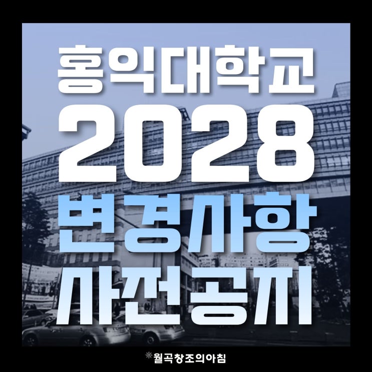 안녕하세요. 강북구 미술학원 월곡창조의 아침 입니다. 한국에서 미대하면 떠오르는 학교 홍익대학교에 대한 소식을 가져왔습니다. 홍익대학교에서 2028학년도부터 시행되는 변경되는 사항들을 전해드리러 왔습니다. 2028 홍익대 미대 변경사항 주요변경사항에 대해 먼저 요약해드리자면 서울캠퍼스에선 미술대학의 일부학과를 하나의 학부를 통합하고 학부 내에서 세부전공을 두어서 학부별 모집 한다는 소식입니다. 세종캠퍼스에서 조형대학 2개 학부의 신입생을 통합하여 모집합니다. 홍익대학교 2028학년도 변경사항에 대해 이어서 설명해드리겠습니다. 홍익대 서울캠퍼스 미대 주요 변경사항 서울캠퍼스 미술학부에 대한 사항입니다. 원래는....... <img src="https://blogthumb.pstatic.net/MjAyNjAzMzFfMTEz/MDAxNzc0OTQyODg1MDY5.tRI7SFQkvf74KWS01rEKca9BM2w_j1TBLovKXKOZFkMg.P6S4Z140WD5m0ThlVPW7FwNEPT6ymrYjvdKGOup-0ecg.JPEG/2028_%C8%AB%C0%CD%B4%EB_%BA%AF%B0%E6%BB%E7%C7%D7_%BB%E7%C0%FC%B0%F8%C1%F6_%282%29.jpg?type=s3" />
