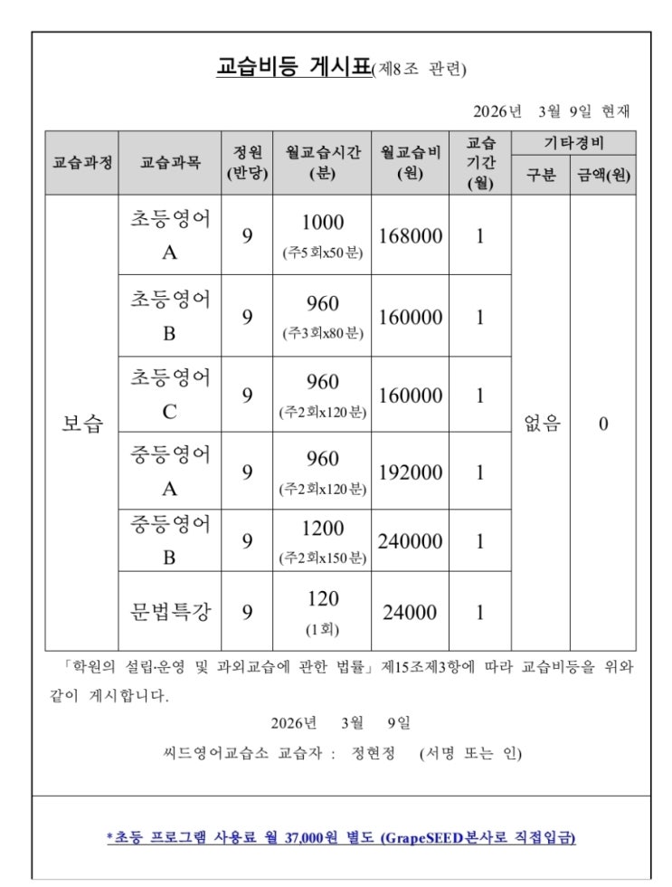 2026년 3월 기준 교습비 안내드립니다. <img src="https://blogthumb.pstatic.net/MjAyNjAzMzBfMjc4/MDAxNzc0ODgwMzY5Mzk3.f7wEz8NsnjKVq9tKEfmyGF4wX5WwGvc6FeDWCzh5j4Qg.J3q4GUt2CZqv2jEAPkwXnFtcQ_cshQ42K3CUvH9c9qkg.JPEG/900%A3%DFScreenshot%A3%DF20260330%A3%DF231407%A3%DFPolaris_Office.jpg?type=s3" />