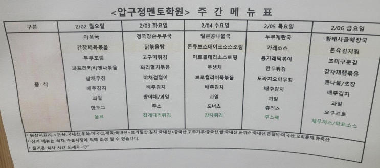 2026 압구정멘토학원 윈터스쿨 2월 1주차 점심 + 식단표