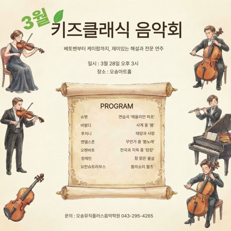 안녕하세요, 오송 2산단 하모니타워 7층에 위치한 뮤직플러스 음악학원입니다! 지난 2월, 아이들과 함께했던 설레는 첫 만남을 기억하시나요? 보내주신 성원에 힘입어, 이번 3월에는 더욱 풍성하고 화려해진 '해설이 있는 3월 키즈 클래식'으로 돌아왔습니다! "베토벤부터 K-POP까지!" 아이들의 귀가 즐거워지는 시간 클래식은 지루하다는 편견은 이제 그만! 이번 3월 공연은 만물이 소생하는 봄의 정취를 가득 담은 프로그램으로 구성했습니다. * 봄의 설레임: 비발디의 '사계 중 봄', 멘델스존의 '봄노래', 요한 슈트라우스의 '봄의 소리 왈츠'까지! * 재미와 활기: 오펜바흐의 신....... <img src="https://blogthumb.pstatic.net/MjAyNjAzMjVfOTYg/MDAxNzc0Mzk2NTE2ODQw.nl9Lod3HmjxIRf4WfdMY14Fl5Z51VEUWe9W0MzOhlwYg.0MW9YIqga9SE4SpNWi1Iu8yUY25CRBceTL9EAxpmTzYg.JPEG/%C5%B0%C1%EE_3%BF%F9%281%29.jpg?type=s3" />