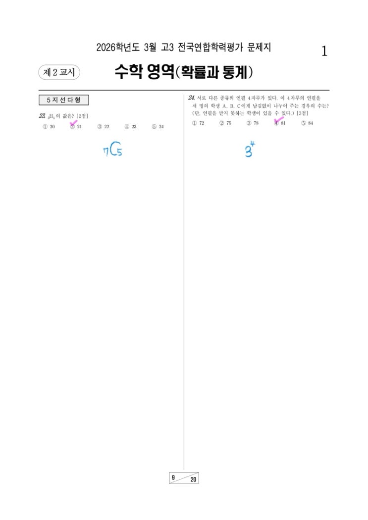 안녕하세요 카이노스수학입니다. 2026년 3월 24일 전국모의고사 확률과통계 전문항 손풀이입니다. 문항 별 주관적인 생각을 써놨습니다. 이를 통하여 원내에서 해설 강의를 진행 합니다. 23번, 24번 : 기본적인 계산문제 입니다. 25번 : 경우에 따른 상황을 그림으로 표현하면 쉽게 접근 가능합니다. 자주 나오는 같은 것이 있는 순열 문제 입니다. 26번 : d값의 따른 경우를 나눈 후 중복조합 문제 입니다. 27번 : (나) 조건으로 같이 올 수 있는 수의 쌍을 만들고, 나머지 수 들이 갈 수 있는 영역을 생각합니다. 벤다이어그램을 그려 생각하면 쉽게 접근 가능합니다. 28번 : 복잡하게 생겼지만 (나) 조건으로 안되는 경우를 생각하여 전체에서....... <img src="https://blogthumb.pstatic.net/MjAyNjAzMjZfMTE5/MDAxNzc0NTMwMDA4Njcw.DUWD77Njqp9kkOcQ2Tf4bs-qn37IYhsTX5NNun9djQ8g.nL8tftdIVbKr2EQaV8TiGdlB1ZF2ANhZs2jX0-sukcQg.JPEG/3%BF%F9_%C8%AE%C5%EB1.jpg?type=s3" />
