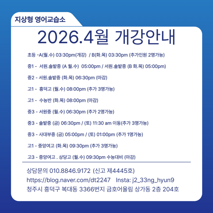 2026.04월 개강 안내 - 복대동영어 복대동영어교습소 지상형영어교습소 청주영어교습소