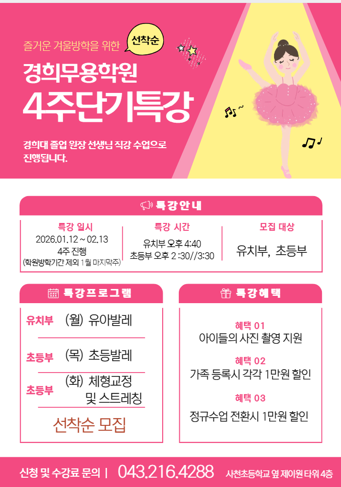 겨울 방학 단기 특강 신청받습니다^^ 2026년 1월, 2월 2주씩 총 4주동안 진행하는 단기 특강입니다^^ 소수정예로 진행되기 때문에 서두르셔야합니다^^ 많은 관심 부탁드립니다♡ ☎️ 216.4288 DM환영♡ 사천푸르지오 앞 제이원타워 4층 경희무용학원 #청주무용학원 #청주무용 #사천동무용학원 #사천동초등방학특강강 사천동초등체형교정정 #사천동발레학원 #내덕동초등방학특강 #사천동유치부방학특강 #내덕동유치부방학특강 #청주방학특강 #사천초 #새터초 #내덕동초등발레 #사천동초등무용 #내덕동체형교정 #주성동초등체형교정스 #율량동체형교정 #덕성초 #내덕동초등체형교정정 #사천동 #내덕동 #청주맘 #사천동유아발레 #사천초....... <img src="https://blogthumb.pstatic.net/MjAyNTEyMjJfMzAw/MDAxNzY2Mzg0NTcyMDMx.jeUmrgUvWaIftdsS8MsUHMLCNF49E5GABPll_ZvBrRMg.dQKwMUictpzNVCS_8wrzuCkv0-rIz2WtURVhbKlHgzUg.PNG/18.png?type=s3" />