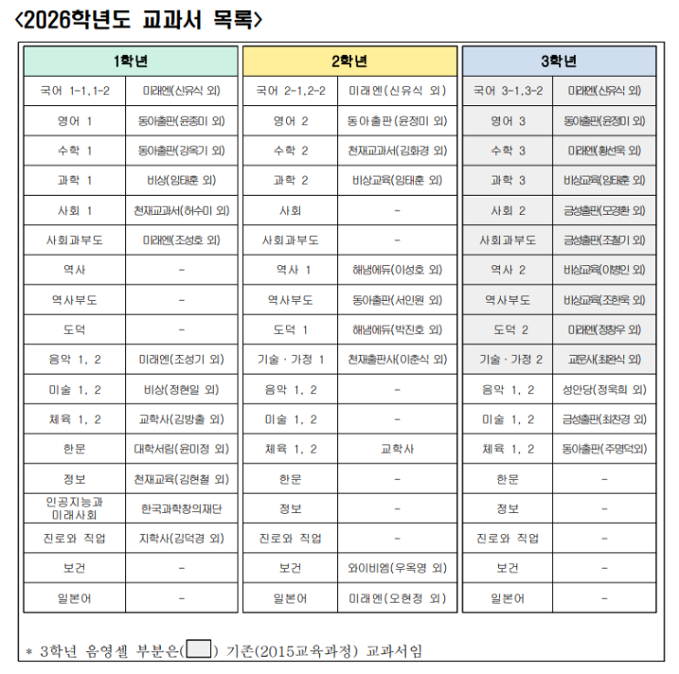 2026 장위중학교, 월곡중학교 교과별 출판사 목록