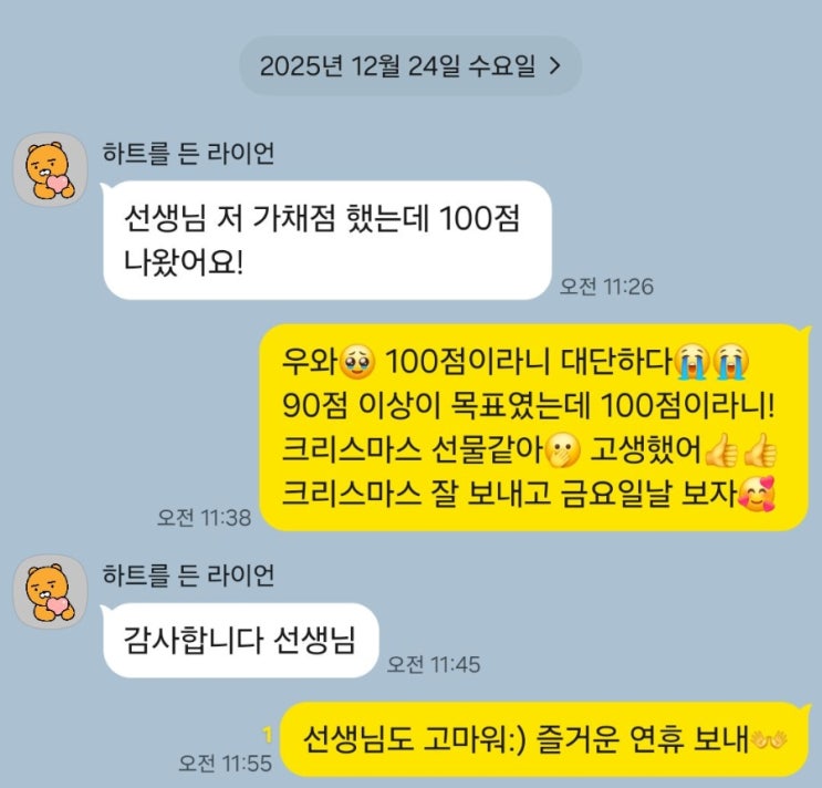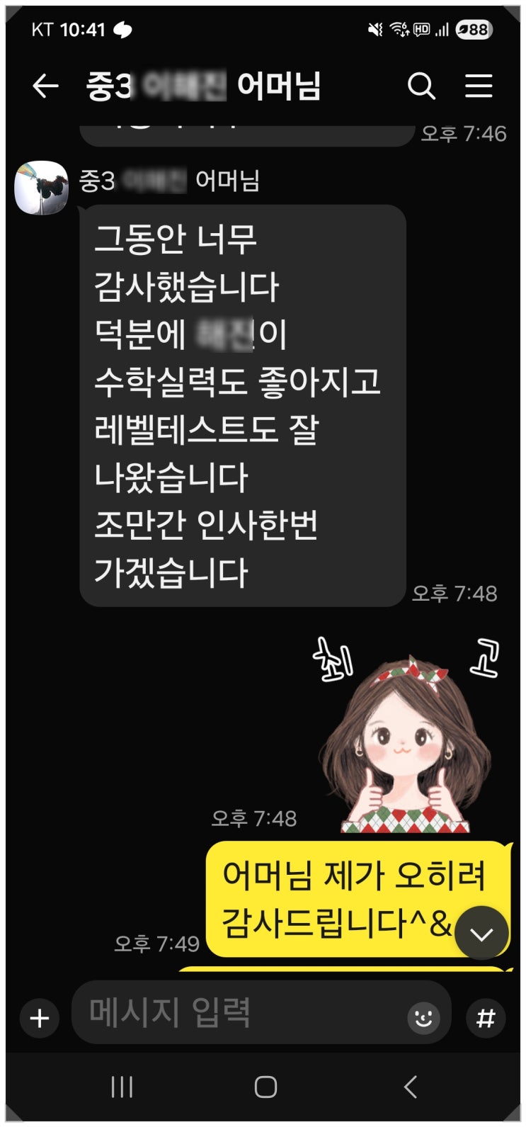 만남이 있으면 아쉬운 헤어짐이 있는데 그런데 이번 헤어짐은 너무 기분 좋은 헤어짐^^ 초3때 부터 키운 내 아들 같은 해★이가 벌써 중3이 되서 수학톡톡 졸업했네요^^ 중학교 내내 중간 기말고사 볼때 그냥 믿음이 가서 맘 놓고 시험장 보내면 항상 제 기대를 저버리지 않고 웃음을 안겨준 녀석이였는데... 내가 '아' 하면 '야어여오요우유으이'를 외치는 녀석이였는데 다른 학원가서도 인정받고 잘한다니 너무 뿌듯합니다.^^ <img src="https://blogthumb.pstatic.net/MjAyNTEyMjNfMTE2/MDAxNzY2NDUyNDUzNTcw.QZpzvTDS2fhyDD1H9405jQt5iNuvJrYBej-ezCuOP3kg.Utdp_900xXhUVX5GEwGip-4_4ddIzeajZ_myb9h3sy4g.JPEG/%C7%D8%C1%F8.jpg?type=s3" />