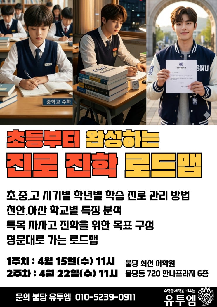 아이의 공부, 그리고 진로 지금 방향이 맞는지 고민되신 적 있으신가요? 천안·아산 지역은 중학교 내신 → 고등학교 선택 → 대입까지 하나의 흐름으로 이어지는 구조입니다. 그래서 초등 시기부터 방향을 잡는 것이 중요합니다. 초·중·고 시기별 학습 전략 천안·아산 학교별 특징 및 내신 흐름 특목고·자사고 진학 준비 방법 명문대까지 이어지는 현실적인 로드맵 막연한 정보가 아닌 바로 적용 가능한 기준과 방향을 전달드립니다. 총 2주에 거쳐 진행됩니다 1차 : 4월 15일(수) 오전 11시 2차 : 4월 22일(수) 오전 11시 불당동 720 불당 최선어학원 (6층) 예약 문의 010-5239-0911 #천안학원 #불당동학원 #유투엠 #불당유투엠 #천안수학학원 #....... <img src="https://blogthumb.pstatic.net/MjAyNjA0MDdfMzgg/MDAxNzc1NTQyMzIyNjA1.9lGrt_QpYIT-id7FpsUvTOpALfboGaj6ZVebyQVMBVwg.iyIF7D2a7WkS6Vy22SSJAxNfAgeUuO3OAnZ-l-ETHCwg.JPEG/001.jpg?type=s3" />