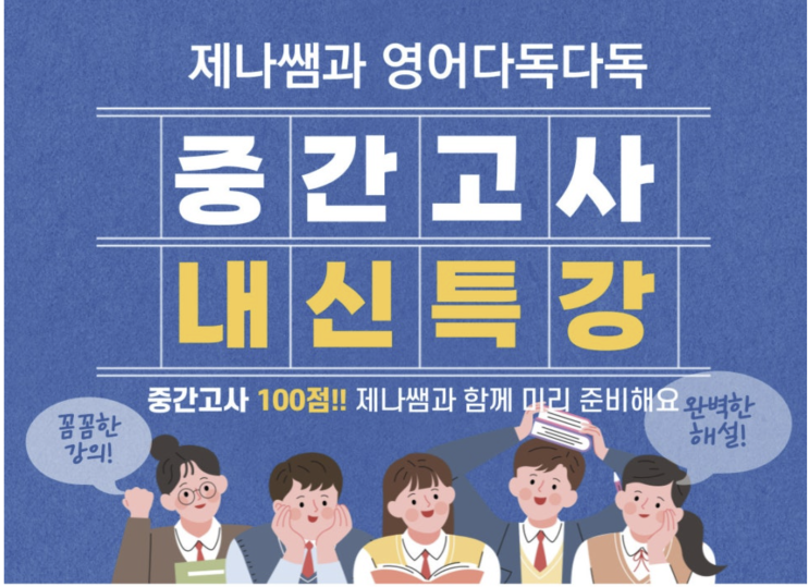 “학교는 알려주지 않습니다. 무엇을, 어떻게 준비해야 하는지!” 제나쌤과 영어 다독다독 학원은 신도봉중·신창중·창북중 전문으로 2014년부터 기출문제와 출제 경향을 철저히 분석해왔습니다. 학생 개개인의 학습 수준을 진단하고, 효율적인 공부 방법과 맞춤 전략을 제시합니다. 10년 넘게 축적된 노하우 + 실전 대비 경험!! 내신 고득점을 향해 아이들과 함께 최선을 다하겠습니다 주말 내신대비 특강은, 제나 원장과 에밀리 부원장이 직접 지도합니다. (학교별 주말내신특강 시간표는 개별 문자안내드려요!!) <img src="https://blogthumb.pstatic.net/MjAyNjA0MDNfMTk0/MDAxNzc1MjA0NTQ0MjUw.sm10PcJdFOOpMzeEt_yZHasQSAxRKEpqVk6ebHs_4FIg.j6gmci3_-o-5aV1AOJYdgI4Puk4mE6ST-9qKwltERuog.PNG/image.png?type=s3" />