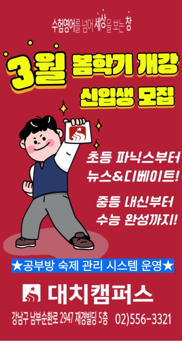 안녕하세요! 수험영어를 넘어 세상을 보는 창 심슨어학원 대치캠퍼스입니다. 3/3(화), 3/4(수) 심슨어학원 봄학기 개강 안내 3월은 늘 특별합니다. 아이도, 부모도 “이번 학기는 다르다”는 다짐으로 출발하지만 막상 시작하면 몸이 마음을 따라주지 않는 시기... 해야 할 건 많은데 시간은 늘 부족하게 느껴지는 시기이기도 합니다. 그래서 3월은 ‘의욕’보다 ‘전략’이 필요한 달입니다. ◈ 3월 학부모님이 꼭 챙기셔야 할 3가지 키워드 ① 아이를 움직이게 하는 힘은 ‘칭찬과 격려’ 공부는 학생 스스로 움직일 때 지속됩니다. 그 시작점이 바로 부모님의 말 한마디입니다. 효과적인 칭찬의 기준은 명확합니다. ●포괄적 칭찬 ❌....... <img src="https://blogthumb.pstatic.net/MjAyNjAyMDlfMTgy/MDAxNzcwNjMzODI0NTg0.xhJ18G1h90z0PG6Mc8p3t-M_K_CfgtajcP1n3rCVbS8g.pNFlKS9l7zTJjPh_E8hcnT2yX9hBFSRVSjsmMQHDCPgg.JPEG/260126_3%BF%F9_%BD%C5%C0%D4%BB%FD%B8%F0%C1%FD_x%B9%E8%B3%CA_%B4%EB%C4%A1-%BA%B9%BB%E7_1.jpg?type=s3" />