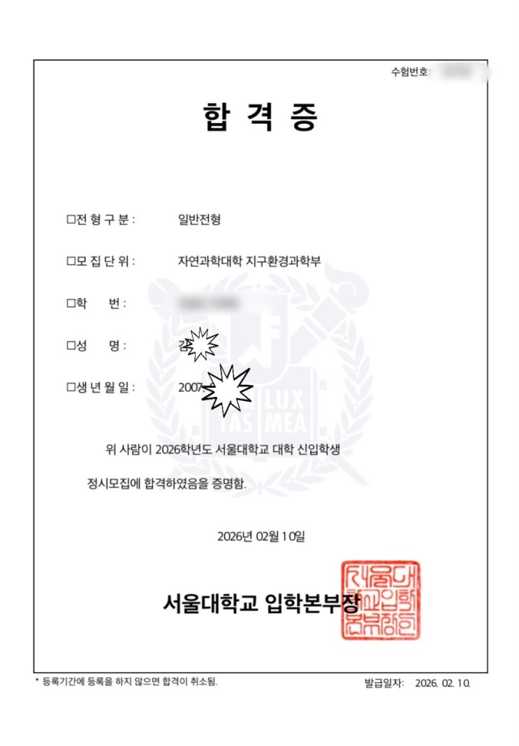 대진여고 김00 학생의 서울대 합격을 진심으로 축하한다. 오늘 김00 학생의 서울대 합격증을 전송받고 그동안 마음고생이 많았을 김00 학생의 얼굴이 자연스레 떠올랐다. 송기수원장은 대학 배치 상담에서 큰 도움을 주지 못하고 몇 가지 조언만 건넸을 뿐인데 김00 학생이 바라는 대로 모든 일이 이루어진 것 같아 더욱 기쁘다. 행운은 노력하는 사람에게 찾아온다는 말이 있는데, 김00 학생을 보면 그 말이 참으로 맞다는 생각이 든다. 앞으로의 앞날에도 지금처럼 행운과 좋은 일들이 가득하길 진심으로 기원한다. 더욱 재미있는 일은 김00 학생의 서울대 합격 소식을 듣고 있던 바로 그 시간에 김00 학생과 동명이인인 학생이 등록하여 첫 수....... <img src="https://blogthumb.pstatic.net/MjAyNjAyMTBfMjAg/MDAxNzcwNzI3MjM3MzIx.puHF7aqIxvmr1dpKm5afGHUjCHAupzQ3JmdzEBkBlqkg.GQw1KvpebhcMq-kgnBsz-mZ7O8dDY9L_muOE0Vi0Hisg.JPEG/900%A3%DF1770705195510.jpg?type=s3" />
