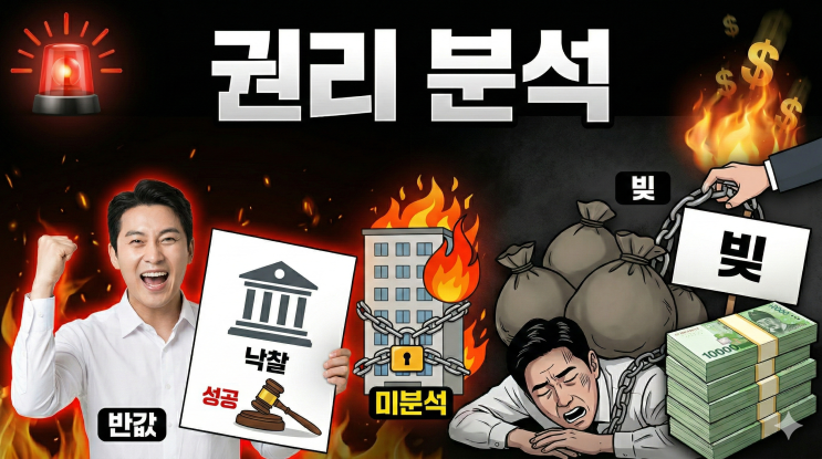 최근 고금리 장기화로 인해 법원 경매로 넘어오는 아파트와 상가 물건이 역대급으로 쏟아지고 있습니다. 뉴스에서 '반값 아파트', '유찰 거듭' 같은 단어가 연일 보도되니, 부동산 초보자분들도 "나도 이번 기회에 시세보다 싸게 내 집 마련 한번 해볼까?" 하는 기대감을 품고 경매 시장을 기웃거리십니다. 하지만 부동산 현장 전문가로서 아주 냉정하게 말씀드립니다. 부동산 법률 지식, 특히 '권리분석'에 대한 완벽한 이해 없이 경매판에 뛰어드는 것은 눈을 가리고 지뢰밭을 걷는 것과 같습니다. 싸게 샀다고 환호성을 지르던 낙찰자가 하루아침에 수억 원의 빚더미에 앉게 되는 무서운 경매의 현실....... <img src="https://blogthumb.pstatic.net/MjAyNjAzMDRfMjE1/MDAxNzcyNTgxOTUwMjU5.p2LvM4hpBBUPgQ9R2ngk2wxF5TpZA9FCTFTZfiV5-Yog.UWMuBJGZgrgAGaY6-8FzsFE6rksz-8NPyOjGgqM_a4kg.PNG/Gemini_Generated_Image_ftltuhftltuhftlt.png?type=s3" />