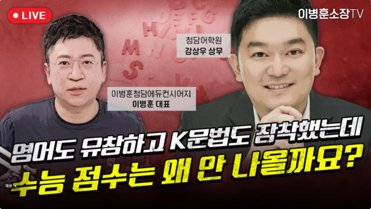 안녕하세요, 청담어학원 중계브랜치 입니다:) 새해에도 학부모님의 가정에 항상 건강과 행복이 가득하시길 기원합니다. 2026년을 맞아 올해의 목표를 세우는 시기에, 많은 학부모님들께 올바른 영어학습에 도움이 될 일정을 안내드립니다. 작년 여름, "이병훈 교육연구소 x 청담어학원" 유튜브 라이브 설명회에 많은 학부모님들께서 참석해 주셨습니다. 라이브 설명회에서 드.디.어 이병훈 소장님을 모시고 중계에서 초등 고학년 부터 중등내신, 고등시험과 고교학점제, 대학교에서 전공까지 앞으로의 우리 자녀들에게 필요한 방향성과 비전에 도움이 되는 설명회를 진행합니다. 안내 일시: 1월 14일(수) 오전 11시 연사: '티처스....... <img src="https://blogthumb.pstatic.net/MjAyNjAxMDZfMjMx/MDAxNzY3Njc2NjMyODIx.PR7P0qk6-vplh8PngRR8Z0OdJWrNkDORdhUg3kJgQ0wg.6AbG5HjugfqjfZOKCIh4Yj33b1GOnb-I5X7VvmoSrUgg.PNG/image.png?type=s3" />