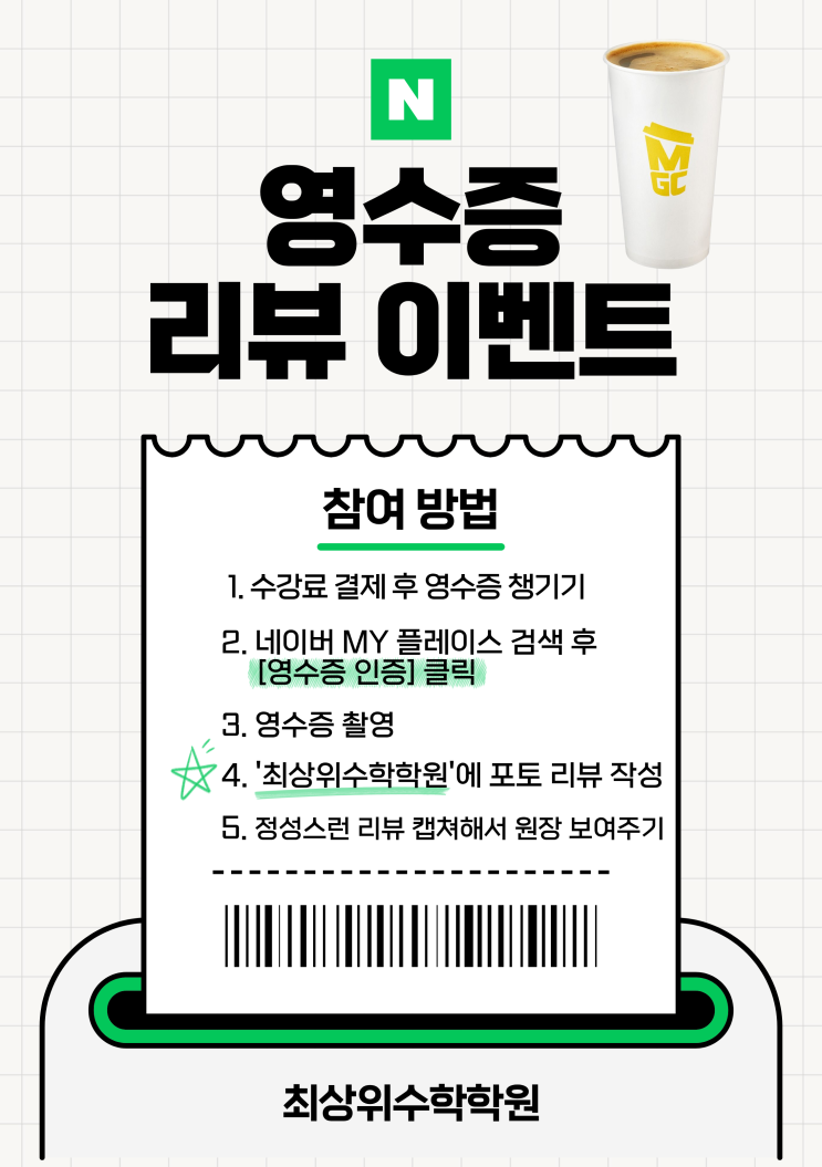 안녕하세요. 상계동 최상위수학학원 최상위쌤입니다. 오늘은 자그만한 이벤트를 진행하기에 소식 전해드립니다. "영수증 리뷰 이벤트" 수강료 결제 후 영수증을 챙기셔서 네이버에서 "MY플레이스" 또는 "영수증리뷰" 검색하신 후 "리뷰 쓰기"에서 "영수증" 클릭 후 이용가능하십니다. 영수증 촬영 후 포토 리뷰 작성 해주시면 되세요. 글에는 응원의 메시지 또는 우리 아이의 학원에서의 즐거움과 성장 이야기를 써주시면 더욱 감사합니다. 정성스러운 글 남겨주시고 나서 캡쳐해서 원장의 카톡으로 전송!!! 그럼 끝나는 이벤트입니다. 그럼 추운 겨울날!! 조금이나마 도움이 되고자 따뜻한 아....... <img src="https://blogthumb.pstatic.net/MjAyNjAxMTVfMjg4/MDAxNzY4NDcyOTA5NDEz.oshiE4EEtQLzeCpxibKJhvpaNPPQAtZochCuc1zMvsUg.O4gqyM1zhD5LX_-7InAQQhb4_1iZM8IYSwQ3PhNdmIAg.PNG/%B3%D7%C0%CC%B9%F6%BF%B5%BC%F6%C1%F5%C0%CC%BA%A5%C6%AE.png?type=s3" />