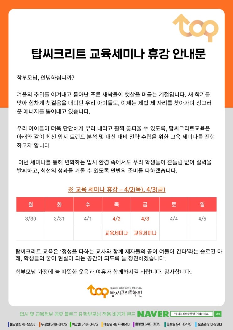 [탑씨크리트 아산원] 4월 세미나 휴강 안내!