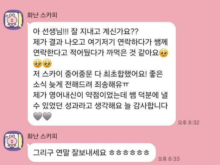 이화외고 32기 학생들 수시 합격소식을 전달합니다. 먼저 영어과의 학생이 SKY 중어중문을 모두 최초합을 했습니다!! SKY를 다 붙은 학생은 정말 드문데 정말 대단합니다. 1학년 첫시험부터 마지막수업까지 함께한 학생이라 더 뿌듯하네요!! 다음은 고대를 붙은 학생들입니다! 두 학생다 붙자마자 바로 연락해와 기쁨을 함께 나눠주어 너무 고마웠습니다. ㅎㅎ 여기까지는 내신 2점대 학생들이었으며 아래는 내신총합 3점대 학생들 결과입니다. 학원에 들어와서 드라마틱하게 성적이 올라준 학생, 1학년부터 3학년 끝까지 함께하며 항상 웃는 얼굴로 수업을 들어 제게 큰 힘이 되어주던 학생, 학원에서는 조용했지만 항상 카톡에서 누구보다도 먼....... <img src="https://blogthumb.pstatic.net/MjAyNTEyMTdfMTIx/MDAxNzY1OTcyMjkxNjAy.SxAIJ4TdlF4ymR3Eh1qomM0OQPyoi8Lq-W2xfA_pMKEg.BL1TLk9EddpTGQmiFkllhDv0K-w16vneVZ1Ps2VTTpIg.JPEG/KakaoTalk_20251217_204855367_01.jpg?type=s3" />