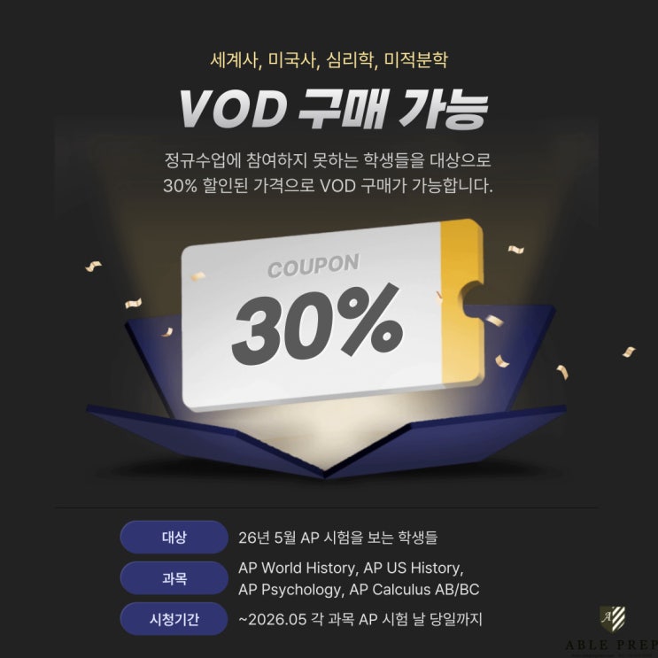 안녕하세요, 해외입시 전문 어학원 에이블프렙 입니다. 오늘은 AP과목 VOD구매를 소개해드리겠습니다. Who? 26년 5월 AP 보는 학생들 What? 16년 이상 강사들의 알짜설명 VOD When? 26년 AP시험 날 당일까지, 언제나! Where? 장소에 구애받지 않고, 어디에서나! Why? 수준 높은 강의라고 입소문이 나서 공부하고 싶지만, 시간이 맞지 않는 학생들을 위해 에이블 프렙 어학원이 특.별.히 준비했습니다! 송나라 부원장님의 AP Calculus AB/BC 영킴 선생님의 AP World History AP US History 크리스틴 선생님의 AP Psychology * 강사님들의 샘플강의 * ✨자세한 내용은 문의 부탁드립니다 ✨ 전화: 02-517-0179 카카오톡: @에이블프렙어학원 카카오....... <img src="https://blogthumb.pstatic.net/MjAyNTEyMjBfNDEg/MDAxNzY2MjE0NjMzOTc0.ieoGd0Fg6GRYGH4UVw6fM-fb38eXx7KSTxQMcu6bip8g.NoE9iOmJYat8oDBjx17fbw608FgYKJKQcdrv3doX9Vkg.JPEG/%B1%E2%C5%B8-%B1%A4%B0%ED-028_%281%29.jpg?type=s3" />