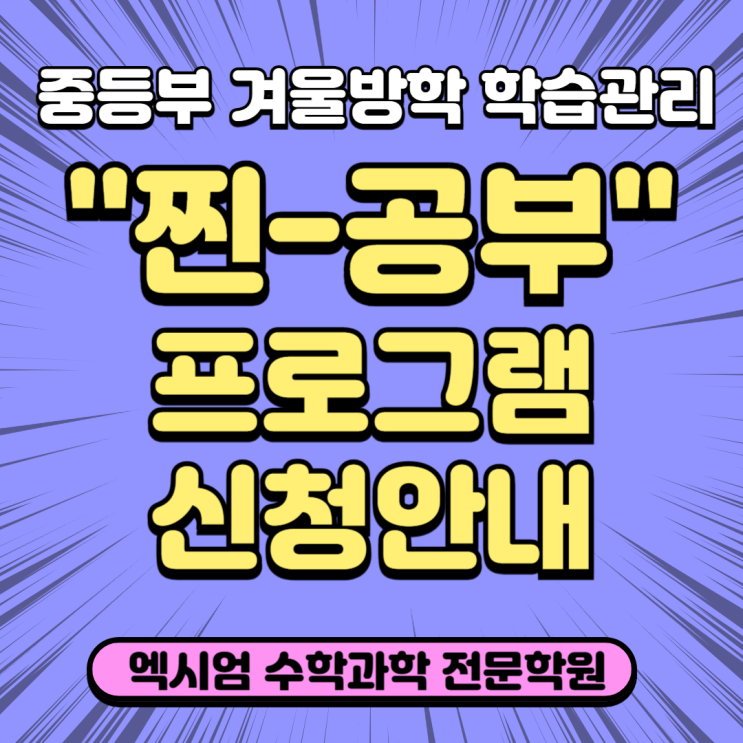 ✔ 겨울방학 찐-공부 프로그램 안내 영락중 충암중 상신중 명지중 숭실중 증산중 학생 여러분 안녕하세요! 방학은 학생에게 휴식이기도 하지만, 동시에 학업적으로 크게 성장할 수 있는 매우 중요한 시간입니다. 지난 학기 동안 부족하다고 느낀 부분을 복습하고, 다음 학기에 필요한 내용을 미리 예습할 수 있는 가장 좋은 준비 기간이기도 합니다. 다만 많은 학생들이 ‘계획’은 세우지만, 실제로 꾸준히 실천하는 과정에서 어려움을 겪습니다. 아침 기상 시간이 늦어지고, 공부가 손에 잡히지 않으며, 휴대폰과 유혹에 흔들리다 보면 방학이 빠르게 지나가 버리는 경우가 많습니다. 방학마다 진행하는 엑시엄의 겨울방학 학습관리 프로그램인....... <img src="https://blogthumb.pstatic.net/MjAyNjAxMDVfMTE3/MDAxNzY3NjE3MTM4MDU3.o75kBXn8r3SRO3CJjHf85z4P-SNFtZY68ex7TyXeV48g.F80VNajQ4Gm4jXkCOB87DSKisHwhOT5PBVhf02WpU0og.PNG/%C1%A6%B8%F1%C0%BB_%C0%D4%B7%C2%C7%D8%C1%D6%BC%BC%BF%E4_-001_%283%29.png?type=s3" />