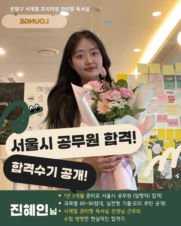 은평구 사계절 프리미엄 관리형독서실에서 집중관리반 담당 선생님으로 근무하며 공무원 시험을 준비했던 진혜인님이 서울시 9급 공무원 시험에 최종 합격했습니다!! 독서실 오픈업무로 하루를 시작, 관리반 업무와 수험을 성실히 병행하였고, 저녁에는 헬스장 운동까지 규칙적으로 기복없는 루틴으로! 1년 2개월 동안 성실하게 수험생활을 이어갔습니다. 국가직 시험에서 아쉽게 탈락하기도 했지만 흔들리지 않고 다시 준비해 지방직에서 "평균 91점 합격"이라는 결과를 만들어냈습니다. 이번 합격수기에는 국가직 탈락 이후 지방직 합격까지의 과정, 시기별 공부 방법, 과목별 공부 전략, 그리고 실제 서울시 9급 공무원 면접 질문과....... <img src="https://blogthumb.pstatic.net/MjAyNjAzMTlfMjY5/MDAxNzczODk2ODU0OTQ5.tGngeNuSiM4K7_wG-266VtSa209iuFQDr2htx2YCxa0g.8H2bii42My5XfifMYepeFVYlz4KgH4bpbc9WgWaxJ5Ig.JPEG/%C7%D5%B0%DD%BC%F6%B1%E2_%C0%CE%BD%BA%C5%B8%BF%EB-004_%282%29.jpg?type=s3" />