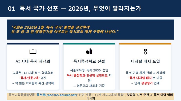 국회는 2026년 1월 '독서 국가' 출범을 선언하며 유치원부터 고등학교 단계까지 전 생애주기를 아우르는 독서교육 체계 구축에 나섰습니다. 교육부는 AI 시대 필수 역량으로 '독서, 인문교육'을 명시했고 서울시 교육청은 '독서 2030'을 선언하며 독서 중점학교, 인문학 실천학교를 지정할 예정인데요! 국가 교육 정책의 방향성은 입시제도와 연결되는 중요한 지점입니다. 과거 글로벌 인재 양성목표로 외국어가 강조되었던 시절에는 명문대 특별전형에도 외국어 능력이 중요해 영어 점수가 높은 아이들이 대학을 잘 갔지요. 이제는 정부에서 독서를 강조하고 창의 융합형 지문이 꾸준히 출제되고 있는만큼 독서를....... <img src="https://blogthumb.pstatic.net/MjAyNjAzMjZfMjY3/MDAxNzc0NTA4MjIwMzk0.N_CXF-HaYJkLTpaPYIBZuaWtxdG6I3uzTm0hil5aCNsg.HLqtDKrmNi8bd_fBLsHfvc1tzBymhdfWQueCcA4OpX0g.JPEG/%B5%B6%BC%AD%B1%B9%B0%A13.JPG?type=s3" />