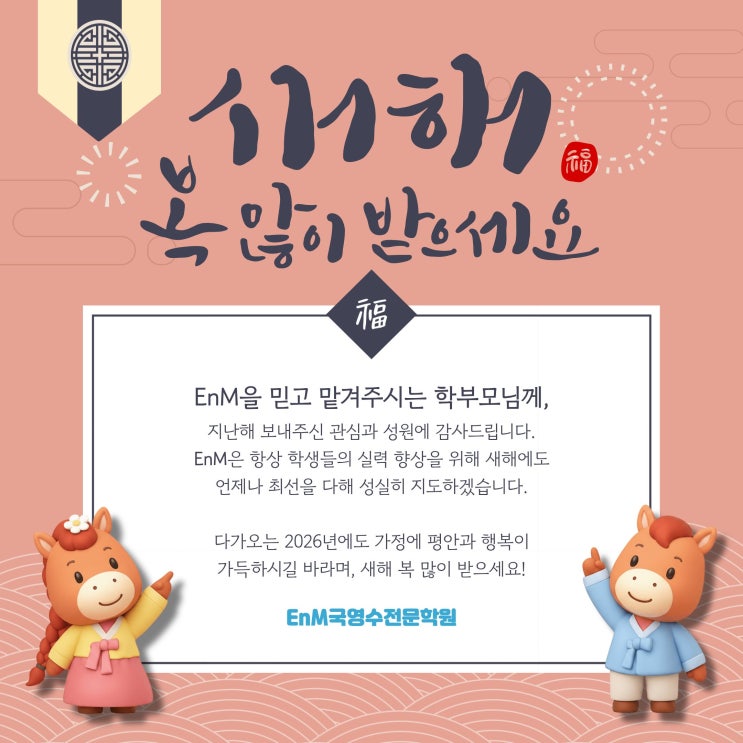Enthusiastic new Method EnM국영수전문학원 안녕하세요~! EnM 국영수전문학원의 소식과 교육정보를 알려드리는 EnM 지킴이 오랜만에 인사드립니다! 2026년 붉은 말의 해, 병오년이 밝았습니다! 2025년 한 해 동안 EnM에게 보내주신 많은 관심과 성원에 감사드립니다. EnM은 새로이 맞이하는 2026년에도 더욱 더 성실히 학생들을 지도하고, 학생들의 강점을 살려 내신대비를 보다 탄탄하고 완벽하게 대비할 수 있도록 최선을 다하겠습니다. 겨울방학을 맞아 EnM에선 중등 문법을 더욱 확실하게 공부하고 보강해줄수 있는 겨울 영어 특강도 진행중이니 많은 관심 부탁드립니다! #새해복많이받으세요 #2026년도EnM과함께 #겨울....... <img src="https://blogthumb.pstatic.net/MjAyNjAxMDlfMTAw/MDAxNzY3OTM3NjI2Nzcx.F2XNeceXFDubrE6DsrLCykdX2U0Z-U1lJkzNgJIErqog.tpifVhrL2H-Ic1VaGNc-l0-1dc5UQW1RJWIbaLlKVegg.JPEG/2026_%BB%F5%C7%D8_%281%29.jpg?type=s3" />
