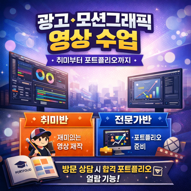 영상 제작이 처음이어도 기초부터 차근차근 취미부터 실무 포트폴리오까지 가능한 영상반입니다. 영상에 관심은 있지만 ‘보기만 하는 것’으로 끝나지 않도록 어도비 일러스트, 포토샵, 애프터이펙트, C4D 등을 이용하여 직접 애니메이션, 광고, 모션그래픽, 키네틱타이포 등 영상을 제작하는 수업입니다. ✔️ 영상 기초부터 애니메이션, 모션그래픽까지 ✔️ 광고 영상 결과물 완성 ✔️ 완성 영상 파일 제공 ✔️ 방문 상담 시 영상고, 청강대 애니과 합격 · 취업 합격 포트폴리오 시청 가능 (선생님께서 제작하신 실제 광고영상) (영상고 합격작) 취미 영상반 영상 입문자 재미 + 완성 중심 짧은 영상(유튜브 인트로 등) 제작 토....... <img src="https://blogthumb.pstatic.net/MjAyNTEyMjdfMTk0/MDAxNzY2ODI0NDU5ODY5.nOC73IvkxhkkGxnBF04M7Hsjfqgl8WnKiXOj0XPmKhog.PwjVnaBfFiSVxuKVT62wkLNwiblcgq1Vr1_ybJp15s4g.PNG/169a367b-37e8-4fd1-9785-41524d357260.png?type=s3" />