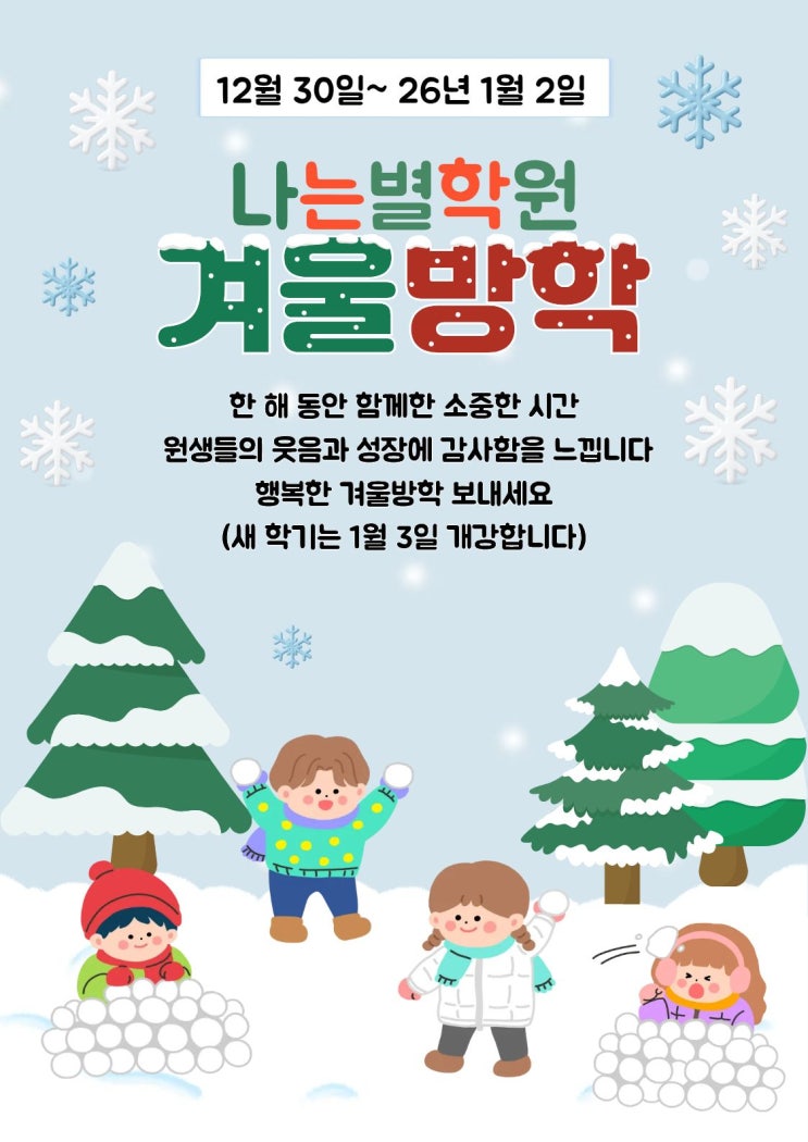 2025년 12월 30일(화)~2026년 1월 2일(금) 학원 겨울방학입니다. 1월 3일(토)부터 새 학기가 시작됩니다. 새 학기 정규수업과 겨울특강도 1월 3일(토) 개강합니다. 한 해 동안 우리 원생들과 함께해서 행복했어요♡ 건강한 모습으로 내년에 만나요! ( 학원등록번호: 제02201400162호 ) <img src="https://blogthumb.pstatic.net/MjAyNTEyMjlfNTYg/MDAxNzY2OTk3NjEzMzY5.h4nNrdbScwovuvdbK26rTs3LGkW8o_dD2heaqMzD_gsg.m1_CFMksf_F0-6e0H-ZIsbUZB6kxjOaWqxfAI4Pruicg.JPEG/2025_%B0%DC%BF%EF%B9%E6%C7%D0_%B0%F8%C1%F6.jpg?type=s3" />