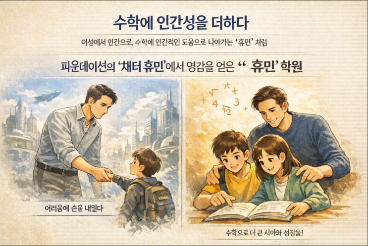 저희 학원의 ‘휴민(Humin)’이라는 이름은 아이작 아시모프의 《파운데이션》에 등장하는 에토 데머젤, 즉 채터 휴민이라는 휴머노이드 캐릭터에서 영감을 얻었습니다. 처음에는 이성적이고 다소 딱딱한 휴머노이드였던 그는 이야기가 진행되면서 점차 인간적인 따뜻함을 갖추고, 인류가 겪는 난관에 도움을 주는 존재로 변모하게 됩니다. 그 무렵 ‘채터 휴민’이라는 이름을 사용하게 되죠. 이러한 의미를 담아, 저희 ‘휴민’ 학원은 수학을 배우는 과정에서 학생들이 어떤 난관에 부딪히더라도 편하게 도움을 받을 수 있는 따뜻한 공간을 지향합니다. 마치 《파운데이션》의 휴민이 인류의 발전 과정에서 어려움에 손을 내미는 것처럼, 저희....... <img src="https://blogthumb.pstatic.net/MjAyNTEyMjNfMTM5/MDAxNzY2NDcwNTE5MTYy.3_j3vWOQK0aKdC4yqPfmo8H4794DSepdhp-FtPohmxMg.doRYFXVn8dLQYJv9DJo-QHQpLYgY8SZ-fpUwgdzVyz4g.PNG/image.png?type=s3" />