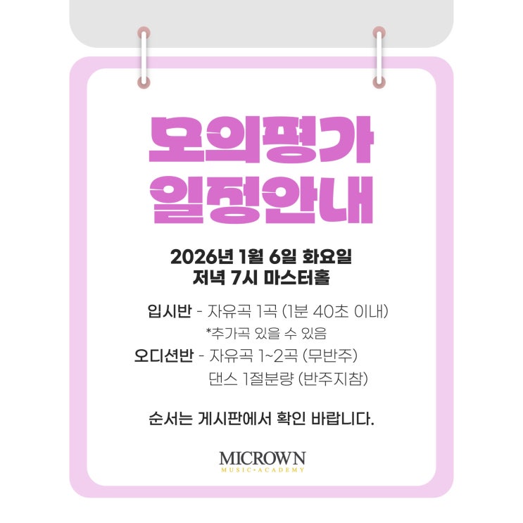 안녕하세요 #전주실용음악학원 마이크라운뮤직아카데미입니다. 4분기 모의평가 일정 안내 드립니다. 일시 2026년 1월 6일 화요일 오후 7시 마스터홀 입시반 - 자유곡 1곡 (1분 40초 이내) *추가곡 있을 수 있음 오디션반 - 자유곡 1~2곡 (무반주) 댄스 1절분량 (반주지참) 순서는 게시판에서 확인 바랍니다. [문의 및 상담 예약] 마이크라운뮤직아카데미 전북 전주시 완산구 유연로 294, 3층 운영시간 : 월~토 13:00 - 22:00 (일요일 휴무) 전화 문의 : 063)224-3111 카톡 상담 : @마이크라운뮤직아카데미학원 모든 상담은 원장님 직접 상담으로 진행됩니다. ‼️ 방문 상담 전 미리 예약 필수 ‼️ [네이버블로그....... <img src="https://blogthumb.pstatic.net/MjAyNTEyMjRfMTk2/MDAxNzY2NTc0MjcwNzE5.2ox9vXTLo8pGxrFyShfwLXmIuxHABVFIKjtqLLYuEyMg.FBu6ncYGb1GIdNgRc84PXZy40wKbg0-tgWR1LirZs8Ug.JPEG/ISIMG-1061585.JPG?type=s3" />