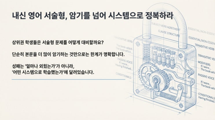 패러프레이징과 서술형이 당락을 가른다 안녕하세요. 기전여고 영어학원 알파영어국어학원입니다. 이번 기전여고 1학년 2학기 중간고사 영어 시험중 고등급을 가르는 주관식 문항들을 핵심 심층 분석한 결과, 매우 흥미로운 출제 패턴을 발견했습니다. 총 7문항(서술형 4문항, 단답형 3문항)으로 구성된 이번 시험은 패러프레이징 변형률이 극단적으로 양분되는 특징을 보였으며, 특히 관계사 구문과 품사 변형이 핵심 변별 요소로 작용했습니다. 이번 글에서는 시험의 세부 패턴을 분석하고, 효과적인 대비 전략을 제시하겠습니다. 출제 범위와 배점 구조 이번 시험은 YBM(박) 교과서 1개 단원(28.6%)과 2025년 9월 고1 모의고사(H1.25.09) 5개....... <img src="https://blogthumb.pstatic.net/MjAyNTEyMTRfNzYg/MDAxNzY1Njk3ODI4OTAy.F2YqHE03yOZO2C16kvDNEwNFR_NJDP-_ZpDzwKMAFTwg.7TbVIpByCwERIsuc3sB_1lZ8PVySi6va266S8BOIQ9Ug.JPEG/%BC%AD%BC%FA%C7%FC_%B0%F8%B7%AB_%BD%C3%BD%BA%C5%DB_1.jpg?type=s3" />