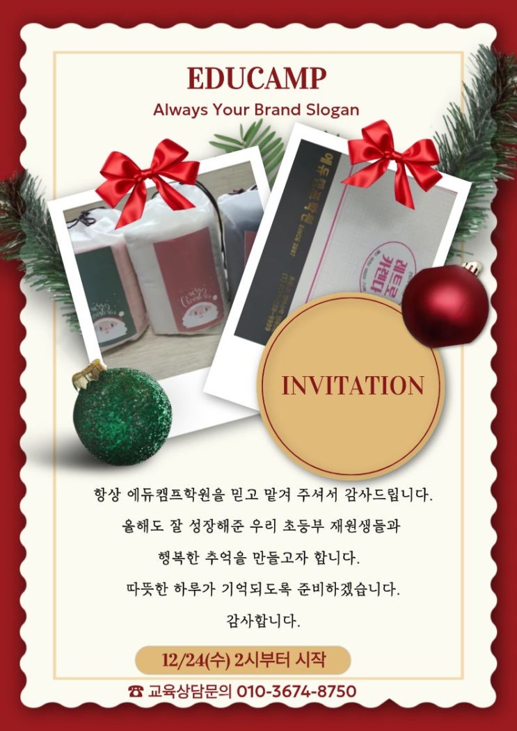 #에듀캠프 #크리스마스 #학원크리스마스행사 #크리스마스학원이벤트 #크리스마스선물 #크리스마스마켓 #전주영어수학전문 #초등부크리스마스행사 #초등쿠폰마켓 영어도 수학도 역시 에듀캠프 안녕하세요. 전주 에듀캠프학원입니다. 즐거운 성탄과 더불어 따뜻한 연말연시 보내시길 빕니다. 1년의 기다림이 모두 채워진 오늘, 드디어 고대하던 2025년 에듀캠프 초등부 크리스마스 행사가 진행되었습니다. 초등부 모든 학부모님들께 감사인사와 더불어 행사 초대장을 발송하였구요. 그리고 . . . . . . 잔치에 빼놓을 수 없는건... 네, 맞습니다. 우리 에듀캠프 초등부 친구들이 1년동안 열심히 모은 쿠폰으로 먹고싶은 음식을 마음껏 교환할 수 있....... <img src="https://blogthumb.pstatic.net/MjAyNTEyMjRfODQg/MDAxNzY2NTY1ODYxMTA4.errAOwzu2eAHklMv0axAQPW4YS2jIsPyjZrurjq2QP4g.2Dq44nxcMpp1ISEPSykypSfFlEWmdX57RhrTTaItPAwg.JPEG/%C1%A6%B8%F1%C0%BB_%C0%D4%B7%C2%C7%D8%C1%D6%BC%BC%BF%E4._%2833%29.jpg?type=s3" />