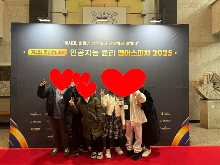 지난 12월, ‘2025 인공지능 윤리 영어 스피치 대회’가 성황리에 개최되었습니다. 미래 사회의 핵심 화두인 인공지능과 윤리를 주제로, 학생들이 영어로 자신의 생각을 깊이 있게 표현하는 뜻깊은 시간이었습니다. 이번 대회에는 우리 위원더영어 친구들 중 2학년 1명 4학년 3명 5학년 1명 6학년 1명 총 6명의 친구들이 참가하였습니다. 사실 이번 대회는 대회 3주를 앞두고 참가를 결정해서서 처음에는 걱정도 정말 많았습니다. “시간이 너무 촉박하지 않을까?” “아이들이 부담을 느끼지는 않을까?” 여러 가지 고민이 들었지만, 참가하겠다고 먼저 손을 든 아이들의 눈빛과 용기를 보며 이번 도전만큼은 꼭 함께해보자고 마음을 모았습니다....... <img src="https://blogthumb.pstatic.net/MjAyNTEyMDhfMTE4/MDAxNzY1MTY0ODYwNjYx.0YAgB4uO6VmEbtU0bPtAYhN3FB9gYRDZzBt1FhEWJ8Eg.CSEg2FZIkzMztaYoYYDvo1T385HkltNqcALtzHsz18Qg.JPEG/%B4%DC%C3%BC.jpg?type=s3" />