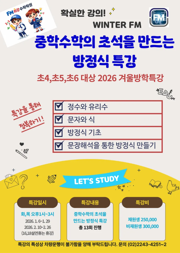 “winter FM MATH” 겨울방학 수학특강 안내 올 한해가 얼마 남지 않았습니다. 마무리 잘하시고 항상 건강하시고 행복하시기를 기원합니다. 겨울 방학 특강을 안내해 드리오니 참고하시어 알찬 겨울방학을 보낼 수 있도록 많은 관심 부탁드립니다. 항상 믿고 맡겨주신데 대해 최선을 다해 보답하도록 노력하겠습니다. 특강의 특성상 일정 인원 이상이 될 경우에 개설되며 개인사정에 의한 결석에 대한 보강이 힘든 부분은 양해 부탁드립니다. 또한 차량운행이 불가함을 양해 부탁드립니다. 감사합니다. 중학 수학의 시작은 방정식입니다. 방정식을 제대로 이해하지 못하면 중1 수학은 물론, 이후 모든 수학이 흔들릴 수밖에 없습니다. FM최강수학....... <img src="https://blogthumb.pstatic.net/MjAyNTEyMjRfMTY2/MDAxNzY2NTY0MzQ5MzI0.fEcTD8Us19a5X3L-W-qWvxd1D4xaHD80REtAZS3Q0Hwg.FIXebd9Uht8yzEv7RKui69CsfoBN3m8cozScPdipBU4g.PNG/900%A3%DF1766493435952.png?type=s3" />