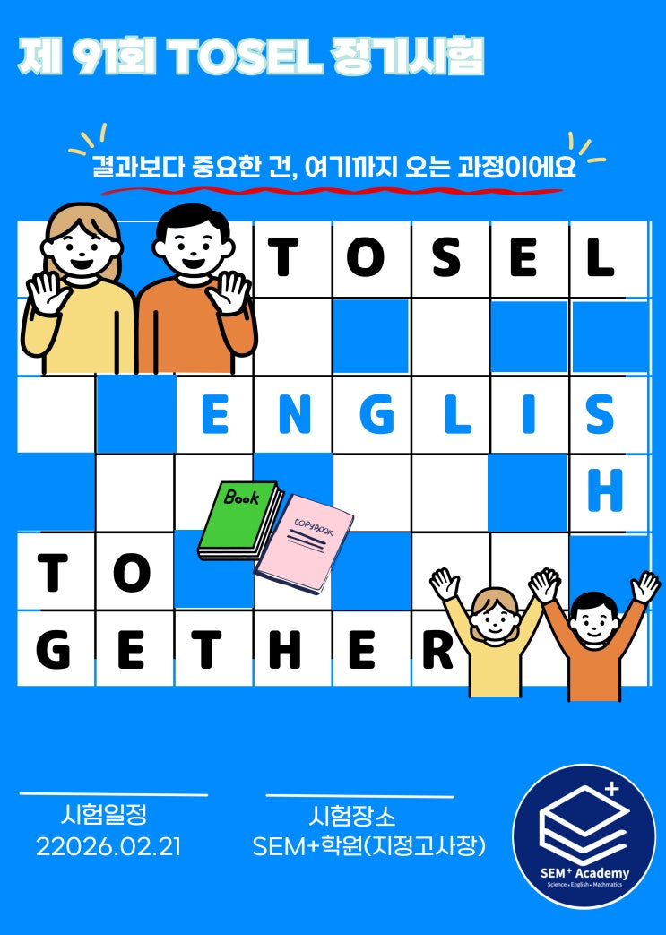 ⭐️ Starter · Junior, 이번에도 ‘과정으로 증명’해요 안녕하세요, 학부모님 SEM+ 학원입니다. 작년 이맘때쯤,우리 아이들이 TOSEL 시험을 준비했던 과정을 블로그에 한 번 공유해드린 적이 있었어요. (아래 링크 클릭↓↓↓↓↓↓↓↓↓↓↓↓) 그때도 많은 학부모님들께서 “시험 결과보다 준비 과정이 더 믿음이 갔다” “아이 영어 실력을 점검하는 기준이 생겨서 좋았다” 라는 말씀을 전해주셨죠. 그리고 올해도, 2026년 2월 21일(토) SEM+ 학원은 다시 한 번 TOSEL 시험을 치르게 됩니다. 이번 시험은 ⭐️ Starter / Junior⭐️ 레벨로 목표는 단 하나, ‘1등급으로 가뿐하게 통과’ 그 목표를 향해 차근차근 준비하고 있어....... <img src="https://blogthumb.pstatic.net/MjAyNjAxMTJfMjMx/MDAxNzY4MjA4NDQ5MDE1.Lt8_xP_iQV8kLeE73500_-n58LSS4e4DVacINC8mLp0g.T3a9UmERNFkWxafNsklaCd-OndeNY8NgkAG8A-G-CV0g.JPEG/XHTPF.jpg?type=s3" />