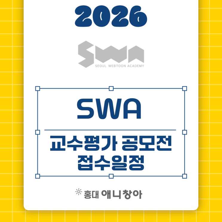 2026년 제6회 SWA 서울웹툰아카데미 교수평가 공모전 접수 일정 안녕하세요! 홍대 애니창아입니다 이번 포스팅에서는 서울웹툰아카데미, SWA에서 개최하는 교수평가 공모전 일정에 대해 안내해 드리려고 합니다. 대상과 최우수상 수상자는 무시험으로 SWA에 합격할 수 있다고 하니 관심있는 학생들은 꼭! 지원하시길 바랍니다 SWA 교수평가 공모전 접수기간은 2026년 4월 20일 월요일부터 6월 26일 금요일까지입니다! 참가 부문이 수작업과 디지털로 나뉘는 만큼, 접수 방법도 상이하기 때문에 접수 방법은 포스팅 하단의 상세 웹페이지를 방문하시어 확인해 주시기 바랍니다 :) 참가비는 25,000원이며 인터넷 접수비 5천 원은 별도입니....... <img src="https://blogthumb.pstatic.net/MjAyNjA0MDFfMTUx/MDAxNzc1MDE1MjA3MTQz.DwhcIdDY4b3bIOo6Pny43IY5wBTN24r5gkxuuP2teJUg.FuY6P8jylqRtAT7vGGyP8vg8spFrIHghPqL5o0up1s8g.PNG/%BD%BD%B6%F3%C0%CC%B5%E51.PNG?type=s3" />