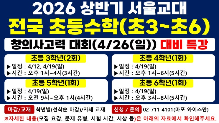 안녕하세요. 마포센터 와이즈만입니다.^^ 2026년 4/26(일)에 있는 서울교육대학교 상반기 전국 초등 수학 창의사고력대회를 안내드리고자 합니다. 전국초등 수학 창의사고력 대회에 참가할 수 있는 대상은 초등 3, 4, 5, 6학년입니다. 시험 문항 수는 총 25문항으로 객관식 20문항, 주관식 및 서술형 5문항으로 구성되어 있습니다. 이 대회를 대비하는 특강이 마포 와이즈만에서는 초등 3학년부터 6학년까지 모두 준비되어 있습니다. 특강 일정은 초등 3학년은 4/12, 10/12(일) 총 2회로 시간은 오후 1시~4시(3시간) 초등 4학년은 4/19(일) 총 1회로 시간은 오후 1시~6시(5시간) 초등 5학년은 4/19(일) 총 1회로 시간은 오전 9시~오후 1시(4시간....... <img src="https://blogthumb.pstatic.net/MjAyNjA0MDJfMjc3/MDAxNzc1MTEwNTIzMTg2.VZhMfL2Rxn_th-TWSmxm1-7_xlAvTNK9j2oUS8x4K3Ag.wLmSeduCTpcyHCFIUuctZsQ6WQTGWJ22omPsMHjyEB0g.JPEG/2026_%C6%F7%BD%BA%C5%CD%28%BB%F3%B9%DD%B1%E2%29_%BF%F8%B3%BB_%B0%D4%BD%C3_page-0001.jpg?type=s3" />