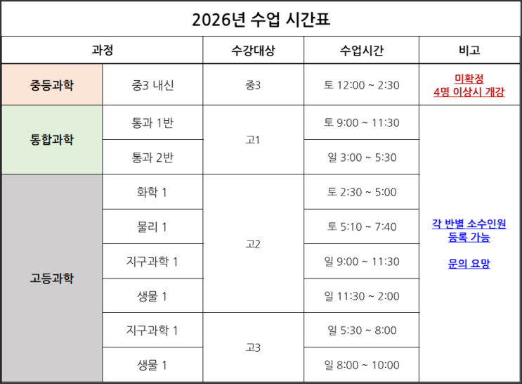 안녕하세요. 오르다과학 입니다. 2026년도 오르다과학학원 시간표 안내 드립니다. 쉼 없이 달려온 2025년을 마무리하는 12월입니다. 오르다 과학학원에서는 아래와 같이 내년도 과학내신 및 수능을 준비할 학생들을 모집하고 있습니다. 2026년 수업 개강은 토요일반 12/20, 일요일반 12/21 이며, 12/27~28은 휴강 입니다. 오르다 과학학원은 소수정원 원장 직강으로 운영하여, 모집인원이 적은 점 양해 부탁드립니다. 수업 전반적인 내용이나 커리큘럼에 대한 자세한 안내는 전화나 방문시에 자세하게 설명 드리겠습니다. 20년 과학교사 경력 원장 직강으로만 진행되는 오르다과학 수업은 한번 입회하시면 수업, 관리 등에 모두 만족하실꺼라고 말....... <img src="https://blogthumb.pstatic.net/MjAyNTEyMTBfMTgw/MDAxNzY1MzY1MDQ5NTM5.UCz4Wjaum2gnmJmRZdv3L8cQnJuDVBLETb6d1rZDf2Ag.rBLG37g13xiKVDtdsDK4Ny2NySR7NKw829YWYypG_aUg.PNG/26.1%BF%F9_%BD%C3%B0%A3%C7%A5.png?type=s3" />