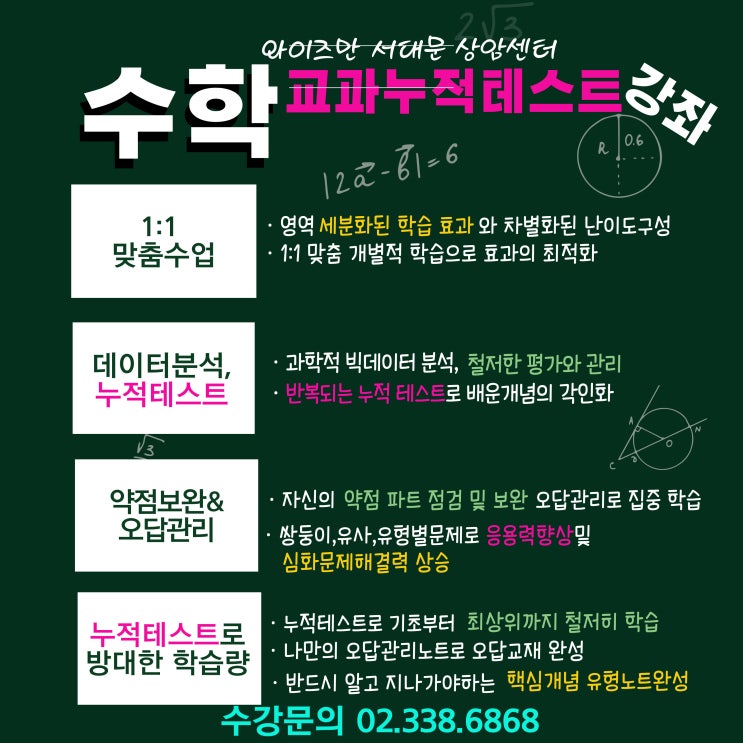 안녕하세요. 와이즈만 마포서대문센터입니다. 교과정규반 프로그램으로 교과누적테스트 시스템을 도입하고 수학이란 과목에 대한 단순히 문제푸는것만을 제공하는것이 아니라 새로운 개념을 이해하고, 누적테스트로 인해 개념의 각인화를 통한 사고력 확장과 창의적 문제 해결력을 증진시킬수 있는 밑거름을 제공하는 교과시스템입니다. 실력이 절로 따라오는 교과시스템으로 1:1 맞춤수업이 진행되고 교사진들은 학생들마다 개별적인 지도를 통해 개인별 장점을 파악하고 이를위해 차근차근 서술하는 방법과 학생 개개인에게 맞는 숙제량을 부여하여 철저한 내신관리를 이뤄내어 원하는 목표를 이루는데 좋은 도약을 이룰수 있게 도와줍니다. 요....... <img src="https://blogthumb.pstatic.net/MjAyNTEyMjNfMTQ3/MDAxNzY2NDcyNzAwNTQ3.1zZH8Db-dG3vSXNI8hZl8lRXhnznkqLM49EAEeHtftsg.2SKS1NIK1kEAyymcR6dQNT5027-LQbH-34re0j5XwSUg.JPEG/%BC%F6%C7%D0%B1%B3%B0%FA%B4%A9%C0%FB%C5%D7%BD%BA%C6%AE.jpg?type=s3" />