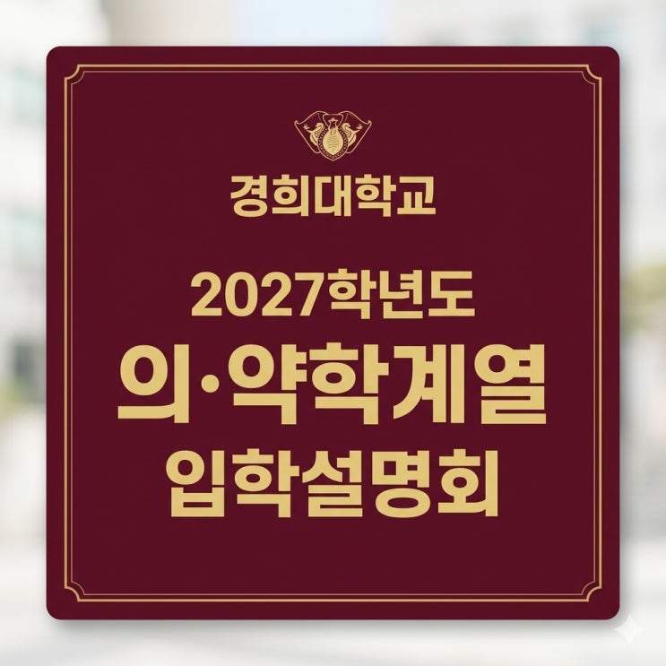 경희대학교는 실질적인 대학입학 정보제공을 위해 학생·학부모를 모시고 「2027학년도 경희대학교 의·약학계열 입학설명회」 를 아래와 같이 실시하고자 하오니 많은 참여 바랍니다. 1. 입학설명회 일정 - 일시: 2026.05.16.(토) 12:00~16:00 - 장소: 코엑스 3F 오디토리움 - 세부일정표 ※ 신청자에 한해 입학설명회 행사 전, 온라인으로 사전질문 접수 예정(추후 안내) 2. 신청기간 및 방법 1) 신청기간: 2026.04.15.(수) 16:00~ [선착순마감] 2) 신청방법: 입학처 홈페이지 온라인 신청 3. 기타사항 1) 사전 신청자 외 현장등록은 불가합니다. ※ 참석희망자는 개별 신청하셔야 합니다. (학생과 학부모가 함께 참석 희망할 경우 각각 신청) 2)....... <img src="https://blogthumb.pstatic.net/MjAyNjA0MDRfMjk0/MDAxNzc1MzEwNTAzNjg3.EofCV74PRrWE1UjJwFH4RlBr2uDAl1TPLzAuShEUXRwg.u5jCMv6wofJTcOH8dKQe_cFhUWDZz2mJdtnfa3wprwwg.JPEG/a175590c-a4c2-45b1-a35a-5cdb89e95e18.jpg?type=s3" />