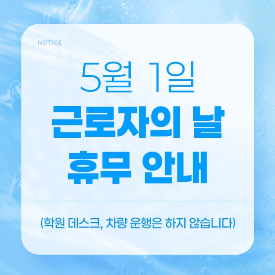 5월 1일 근로자의 날 휴무 안내 학원 데스크, 차량 운행은 하지 않습니다. 단, 수업 진행 여부는 각 반 담당 선생님의 재량에 따라 달라질 수 있으니, 수업 여부는 꼭 담당 선생님께 직접확인해 주시기 바랍니다. <img src="https://blogthumb.pstatic.net/MjAyNjA0MDZfMjYy/MDAxNzc1NDUzMTk0NjI5.LrOatY-tMgOjD8RV7cl0uq4b-xzoTvi9bLi3YAvl8TUg.W0zZKESPPdTwRTsSiM7N-siL85Y9hiFyQf0x1EKxO1kg.JPEG/260406_%B1%D9%B7%CE%C0%DA%C0%C7%B3%AF_%C8%DE%B9%AB_%BA%B9%BB%E7.jpg?type=s3" />