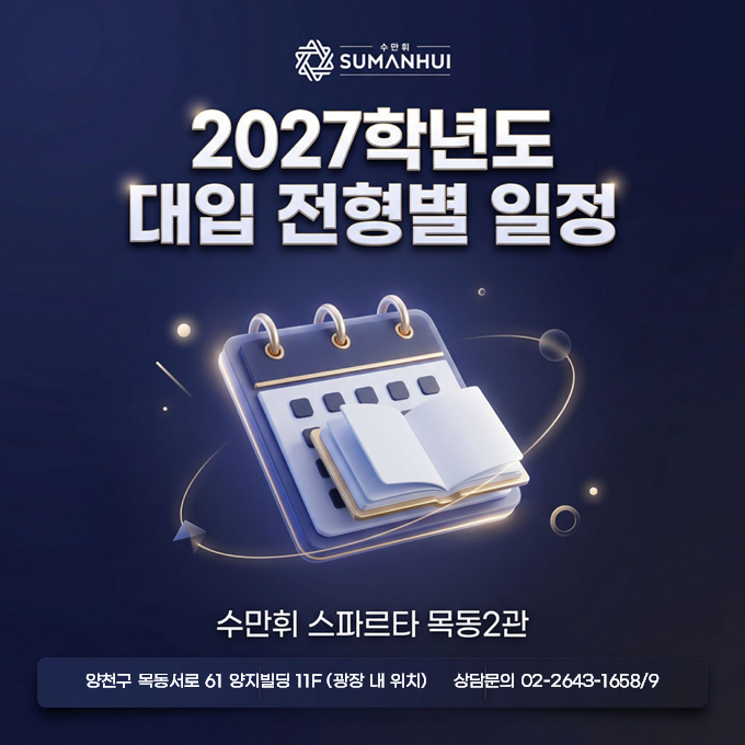 안녕하세요, 수만휘 스파르타 목동2관입니다 :) 고3 수험생이라면 반드시 체크해야 할 2027 대입 일정! 본격적인 입시 방향과 학습 계획을 수립해야 하는 시기, 전형별 일정을 꼼꼼히 확인하는 것이 무엇보다 중요합니다. 수만휘는 여러분의 목표 달성을 돕기 위해 2027학년도 대학 입시 일정을 수시/정시, 4년제/2·3년제 전형별로 한눈에 확인할 수 있도록 준비했습니다. 성적 확보는 물론, 전략적인 입시 준비까지 고려하여 고3부터 재수·N수생까지 모두 참고할 수 있는 일정이니, 가장 먼저 시작되는 2027 수시 원서 접수 기간부터 차근차근 대비해보시기 바랍니다! 2027 대입 일정 중 수시 전형은 4년제와 2·3년제로 구분되며, 일....... <img src="https://blogthumb.pstatic.net/MjAyNjAzMjZfNzMg/MDAxNzc0NDk4ODUxMTU0.lFTgmkajk0xngyzZKK9vtkcqpSdMB8QF_g7oh8JdFt8g.ielJgz8SiOMNuf2Iq_l0N6vI9MD9Xk0j5i7tHyuKlXkg.PNG/260326_%BA%ED%B7%CE%B1%D7_%B0%D4%BD%C3%B9%B0.png?type=s3" />
