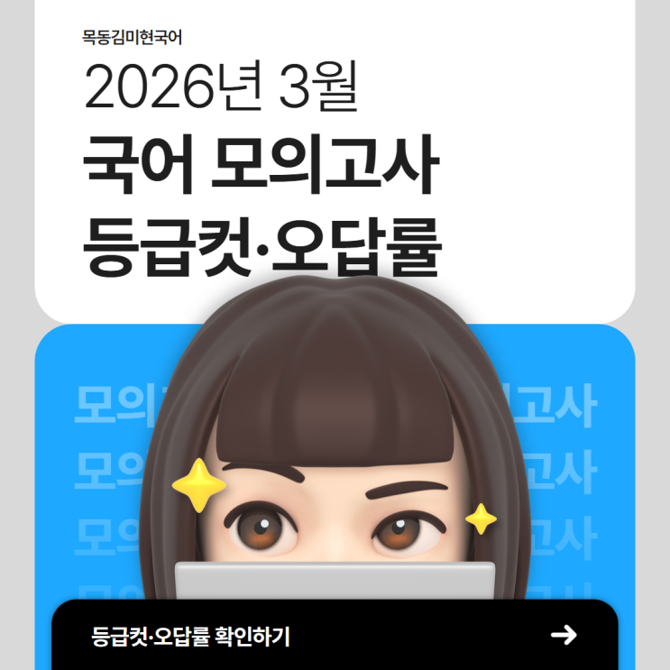 안녕하세요. 목동 국어의 자존심, 김미현국어학원입니다. 2026학년도 첫 관문인 3월 학력평가를 치른 우리 학생 여러분, 그리고 함께 마음 졸이신 학부모님들 모두 정말 고생 많으셨습니다. 새 학년 첫 시험은 '점수' 그 자체보다 '나의 약점을 정확히 파악하는 것'이 훨씬 중요합니다. 시험 직후 쏟아지는 수많은 정보 속에서 학부모님과 학생들이 가장 궁금해할 등급컷, 난이도, 그리고 정답지를 빠르게 정리해 드립니다. 1. 2026년 3월 모의고사 국어 등급컷 (EBS 기준) 가장 궁금해하실 등급컷입니다. 이번 국어 1등급 컷(원점수 기준)은 86점으로 예측됩니다. 본인의 가채점 점수와 비교해 보세요! 1등급: 86점 2등....... <img src="https://blogthumb.pstatic.net/MjAyNjAzMjlfNTIg/MDAxNzc0NzcxMzk2Mzk0.J9tJnC5JEf4XuKjI35EaMQ3sf6fo7gkwmdCxHpFvVPUg.EdLmFRHSS-rQcNMN0lpJxnkKxAf7C8wfJU7yTanvUjwg.PNG/%C1%A6%B8%F1%C0%BB_%C0%D4%B7%C2%C7%CF%BC%BC%BF%E4_%288%29.png?type=s3" />