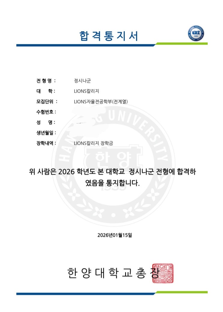 [여수 독학 재수학원] 한양대학교 자율전공학부 (장학금) 정시 합격!!!
